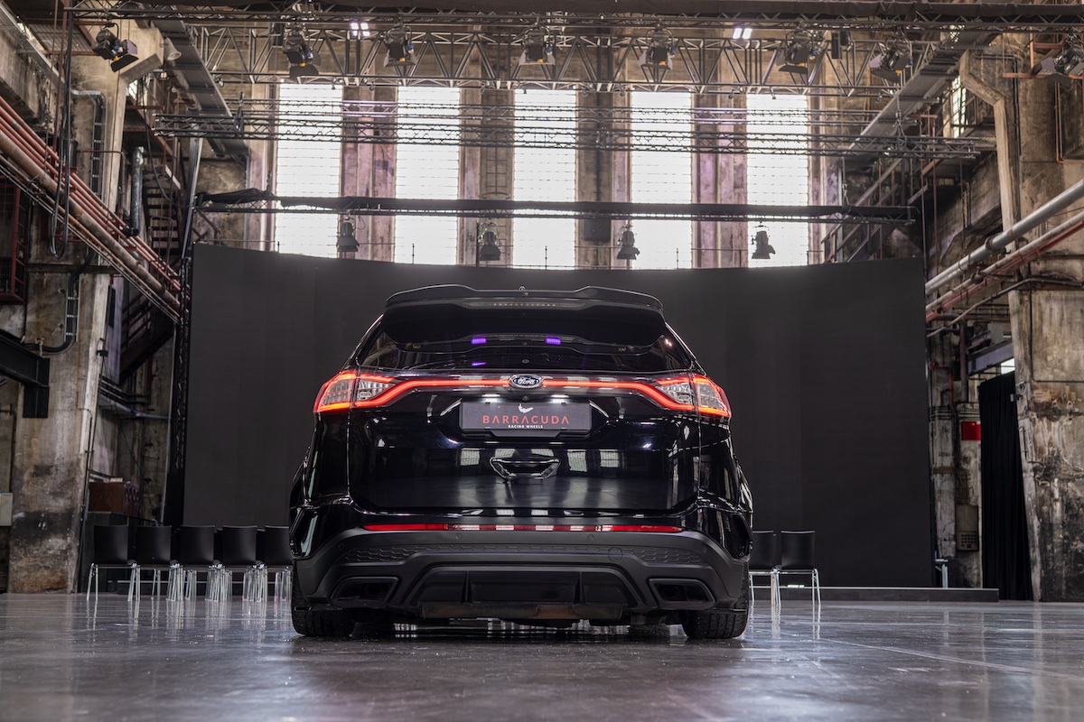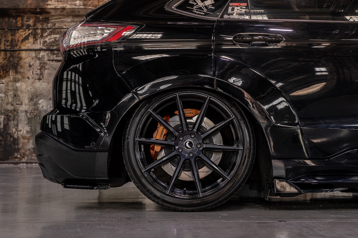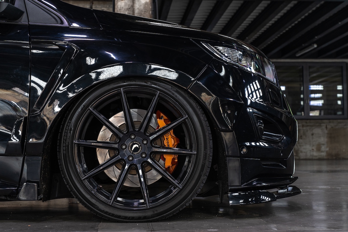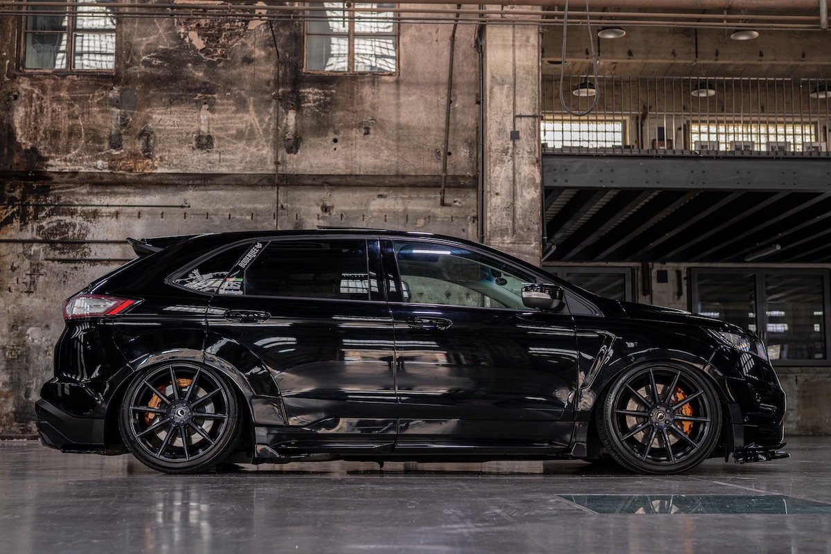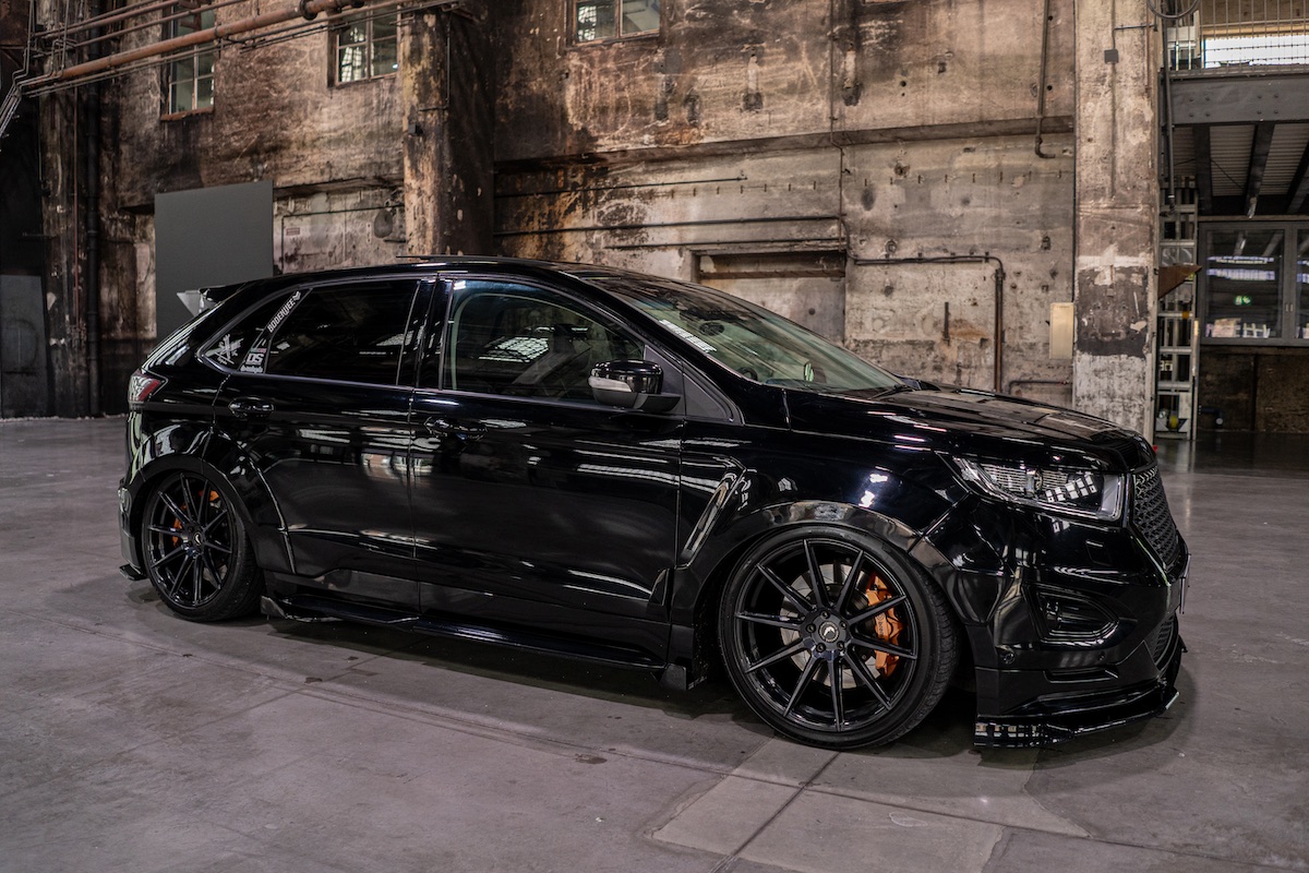Zur weiteren Verstärkung seiner Eyecatcher-Qualitäten erhielt der Edge ein Breitbau-Upgrade aus dem Hause SS Tuning, welches auf solcherlei Widebodys für Ford-Modelle spezialisiert ist. Neben den Kotflügel-Verbreiterungen umfasst der Kit auch Ansätze für die Seitenschweller und die Heckschürze. Die abrundend ebenfalls geänderte Front zeichnet sich unter anderem durch einen Kühlergrill ohne Markenlogo und eine Spoilerlippe aus.