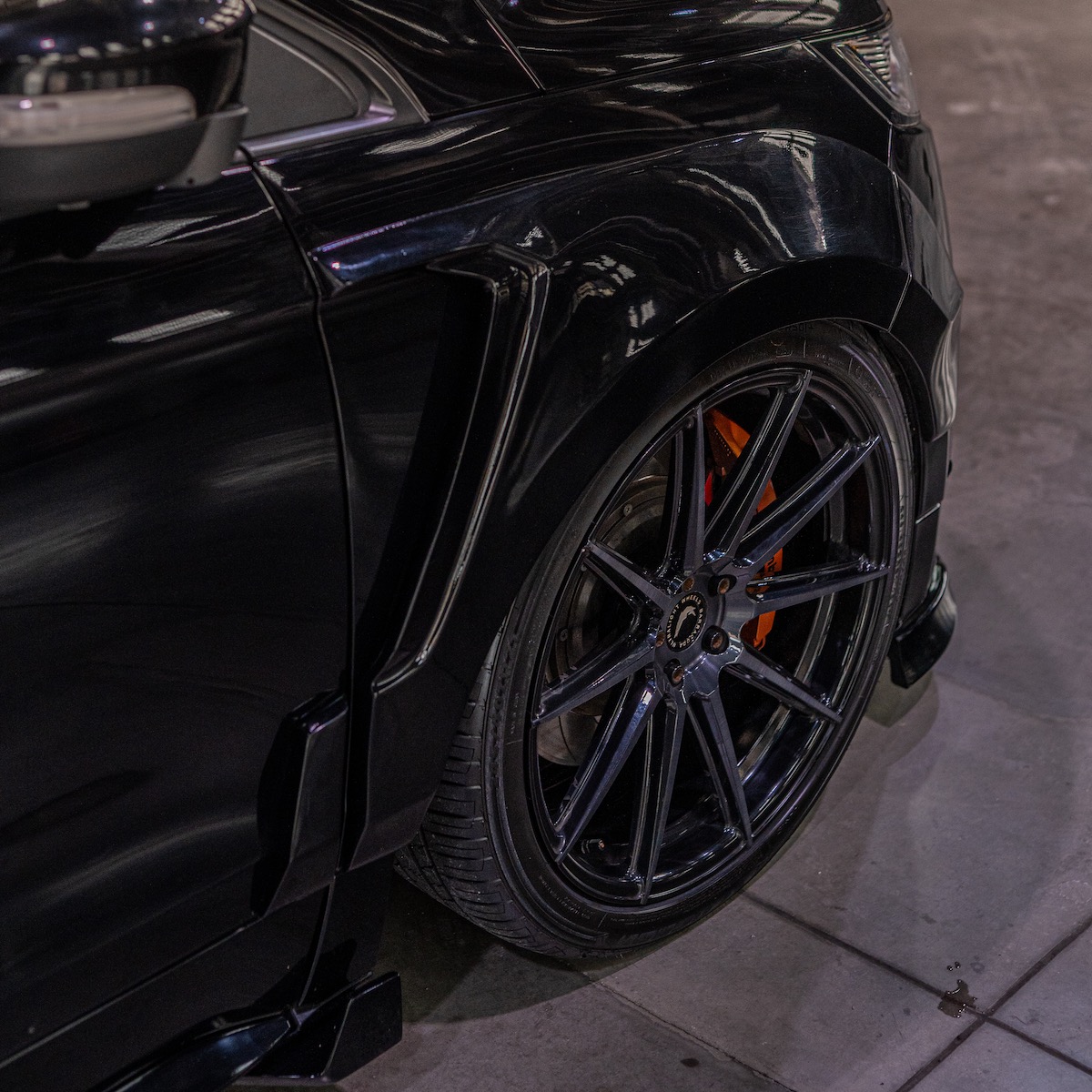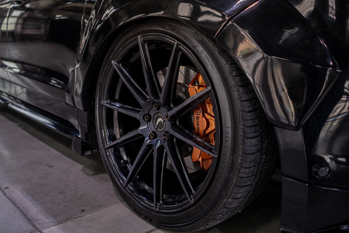 Genauer gesagt steht der Edge von Besitzer Sascha auf Project 2.0-Rädern aus Barracudas Ultralight Series. Dementsprechend sind sie dank der Produktion im Flow Forged-Verfahren sehr leichtgewichtig. Trotz ihrer üppigen Dimensionen von 9×21 Zoll wiegen sie nur etwa 11,9 Kilogramm. Die zugehörige Bereifung misst 245/40R21 und mit ihrem Finish in Higloss Black Brushed passen die Felgen farblich perfekt zur schwarzen Lackierung des Fords.