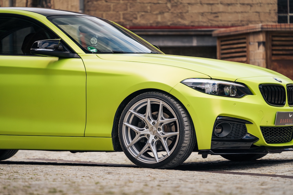 Das passionierte Cargirl ist keine Unbekannte, sondern auf Instagram unter dem Namen Zimtzxcke aktiv und hat dabei eine beeindruckende Community von etwa 26.400 Followern aufgebaut. Nachdem ihr in markantem Neon-Gelbgrün vollfolierter 220i zuvor auch schon auf anderen Barracuda-Rädern unterwegs war, entschied sie sich zuletzt für die stylischen Razzer-Felgen aus Barracudas Ultralight Series. Sie zeichnen sich durch ein detailverliebtes Y-Speichen-Design und ein Finish in Hyper Silber aus. Die Dimensionen betragen rundum 8,5×19 Zoll und die zugehörige Bereifung misst an der Front 225/35R19 und am Heck 245/30R19. H&R-Tieferlegungsfedern lassen den BMW noch geduckter auftreten und runden das Setup somit perfekt ab.