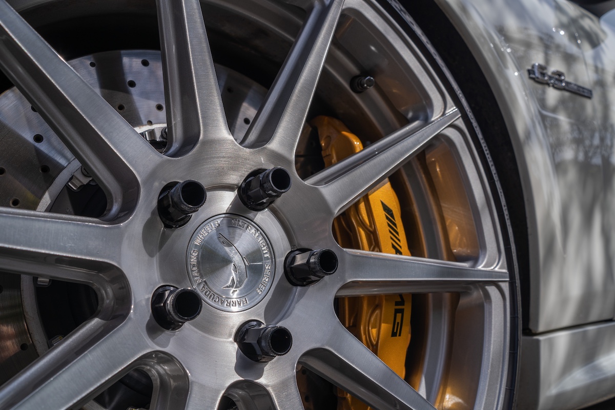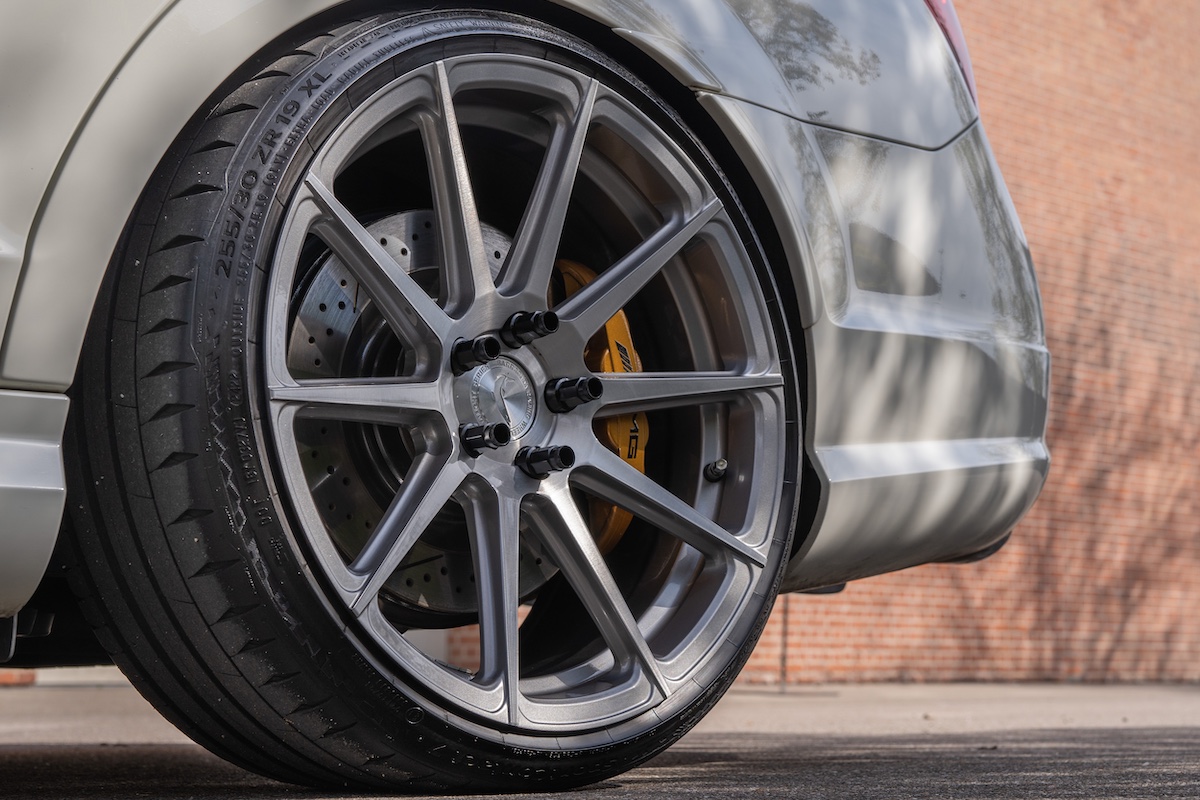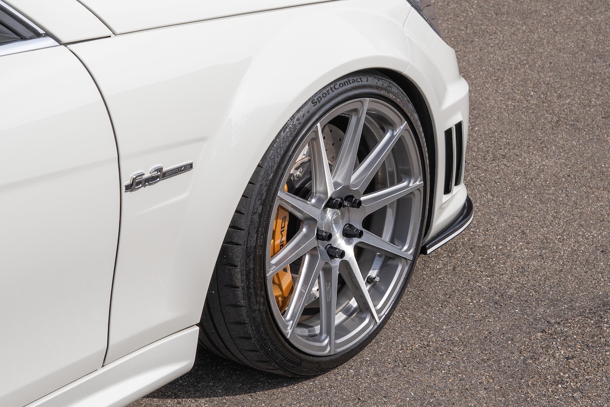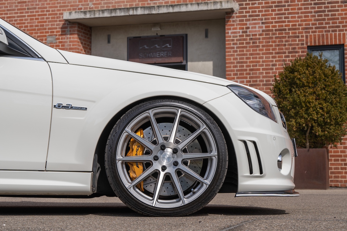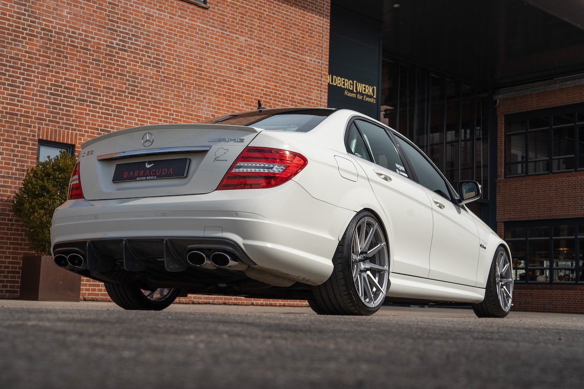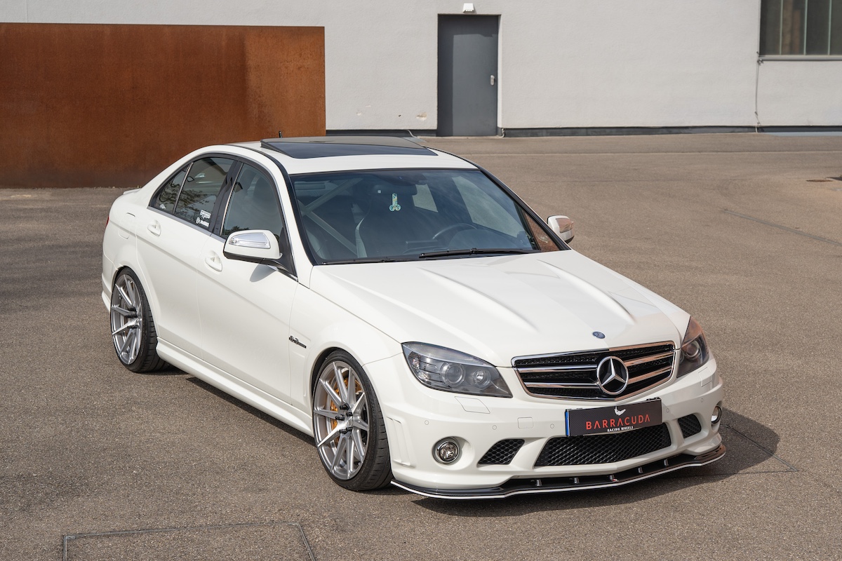 Großvolumige Achtzylinder-Motoren werden heutzutage leider immer seltener – umso mehr außerhalb des US-Car-Sektors. Stattdessen setzen die Hersteller selbst in ausgewiesenen, leistungsstarken Modellversionen zunehmend auf Downsizing. Mercedes war eines der Unternehmen, das noch recht lange am frei saugenden V8 mit reichlich Hubraum festhielt: in den 63er AMG-Modellen. Abschied nehmen musste der 6,2-Liter M156-Achtzylinder schließlich Mitte 2015 mit dem Ende des C 63 AMG der Baureihe 204. Das hiermit vorgestellte Limousinen-Exemplar wurde mit einem Satz Barracuda Racing Wheels und weiteren Upgrades individualisiert.