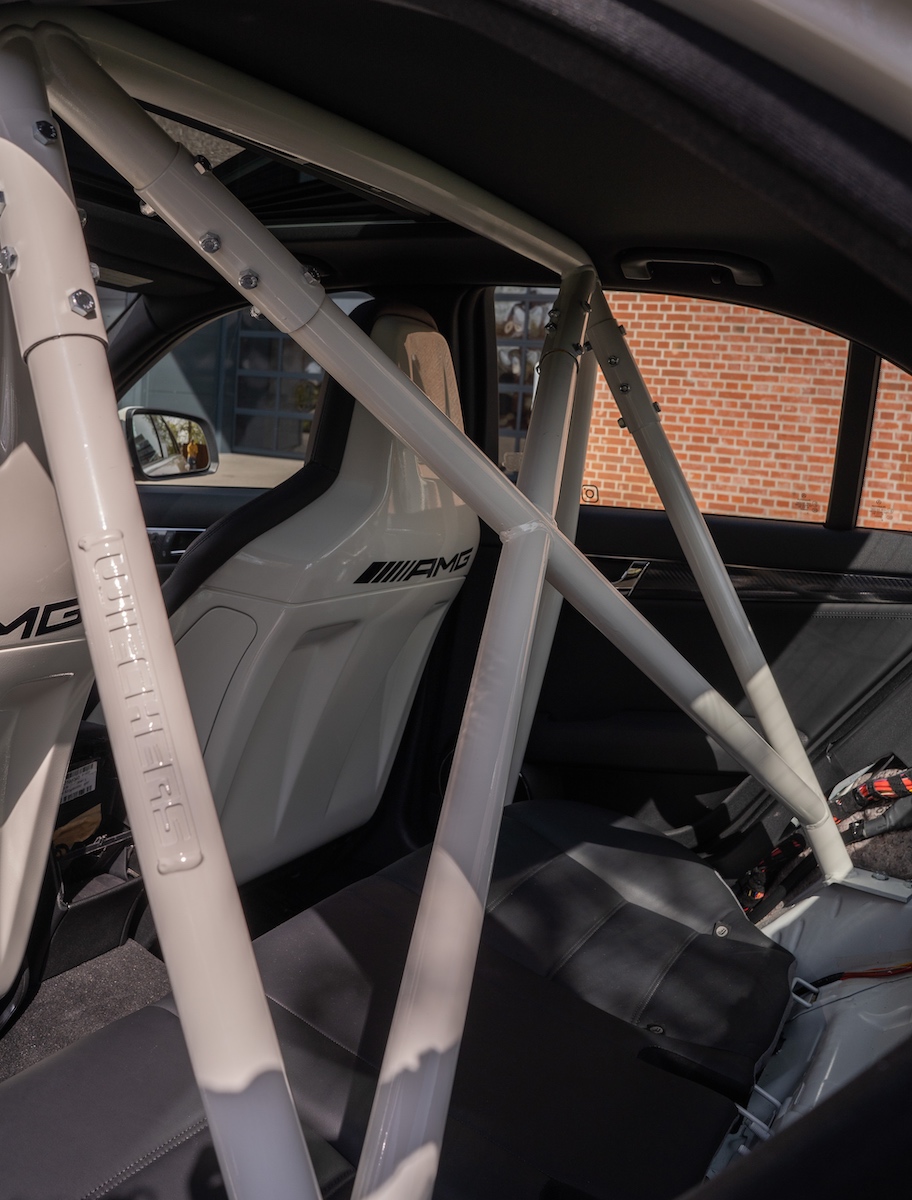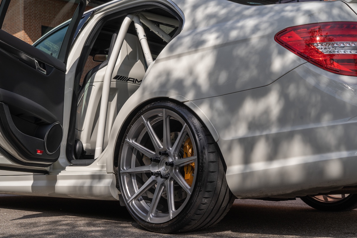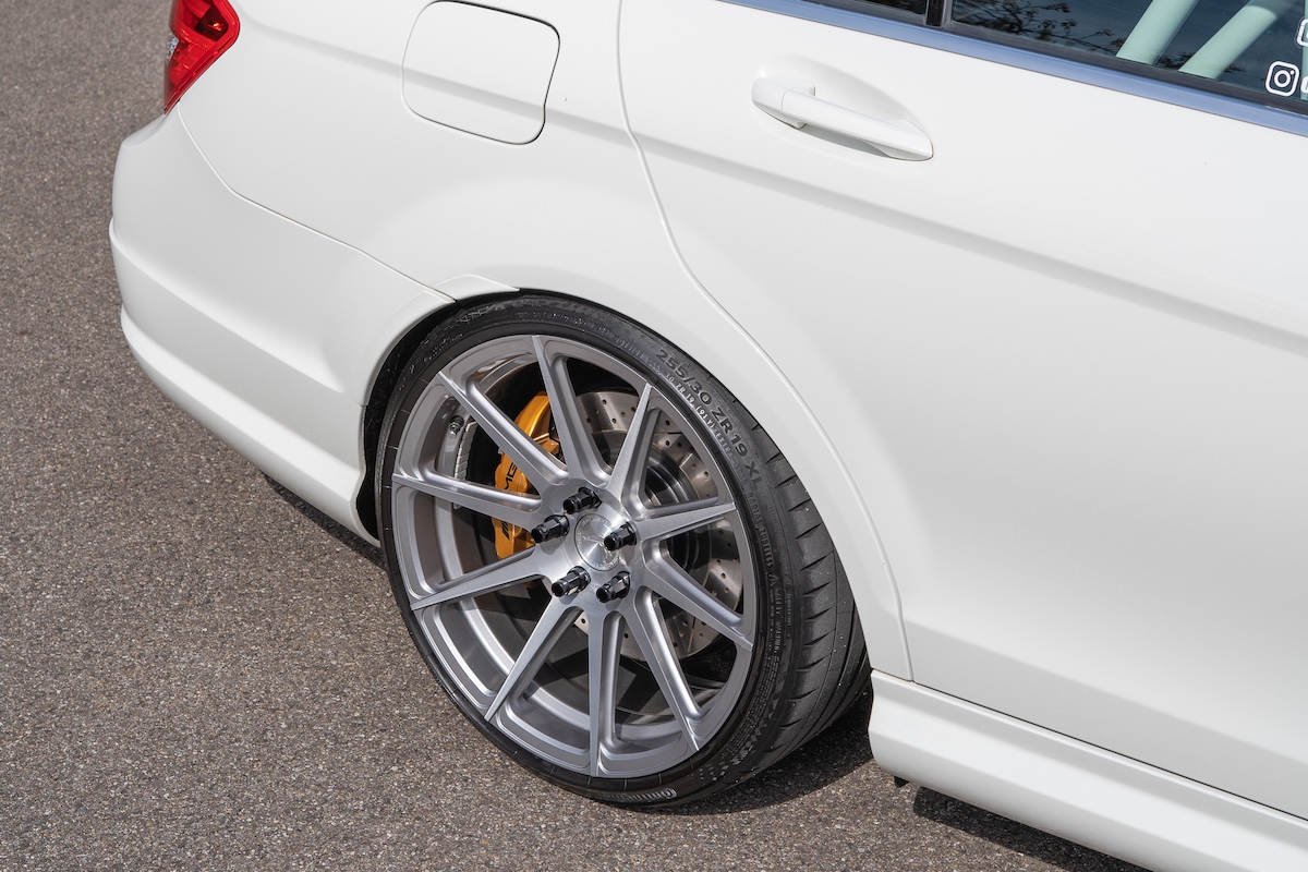 Dass die neuen Kombinationen bestens in den Radkästen ausgerichtet sind, ist einer ergänzenden Tieferlegung zu verdanken. Der W204-Besitzer, welcher den gesamten Umbau in Eigenregie umsetzte, spendierte seinem Affalterbacher Sportler ein Variante 3-Gewindefahrwerk aus dem Hause KW. Es reduziert die Bodenfreiheit vorne um etwa 45 und hinten um circa 40 Millimeter. Last but not least sorgt ein Wiechers-Überrollbügel für einen Motorsport-Touch im Interieur des weißen Stufenheck-AMGs. Übrigens: Wer mehr über die Limousine erfahren will, kann dies auf Instagram unter c_classbadass tun.