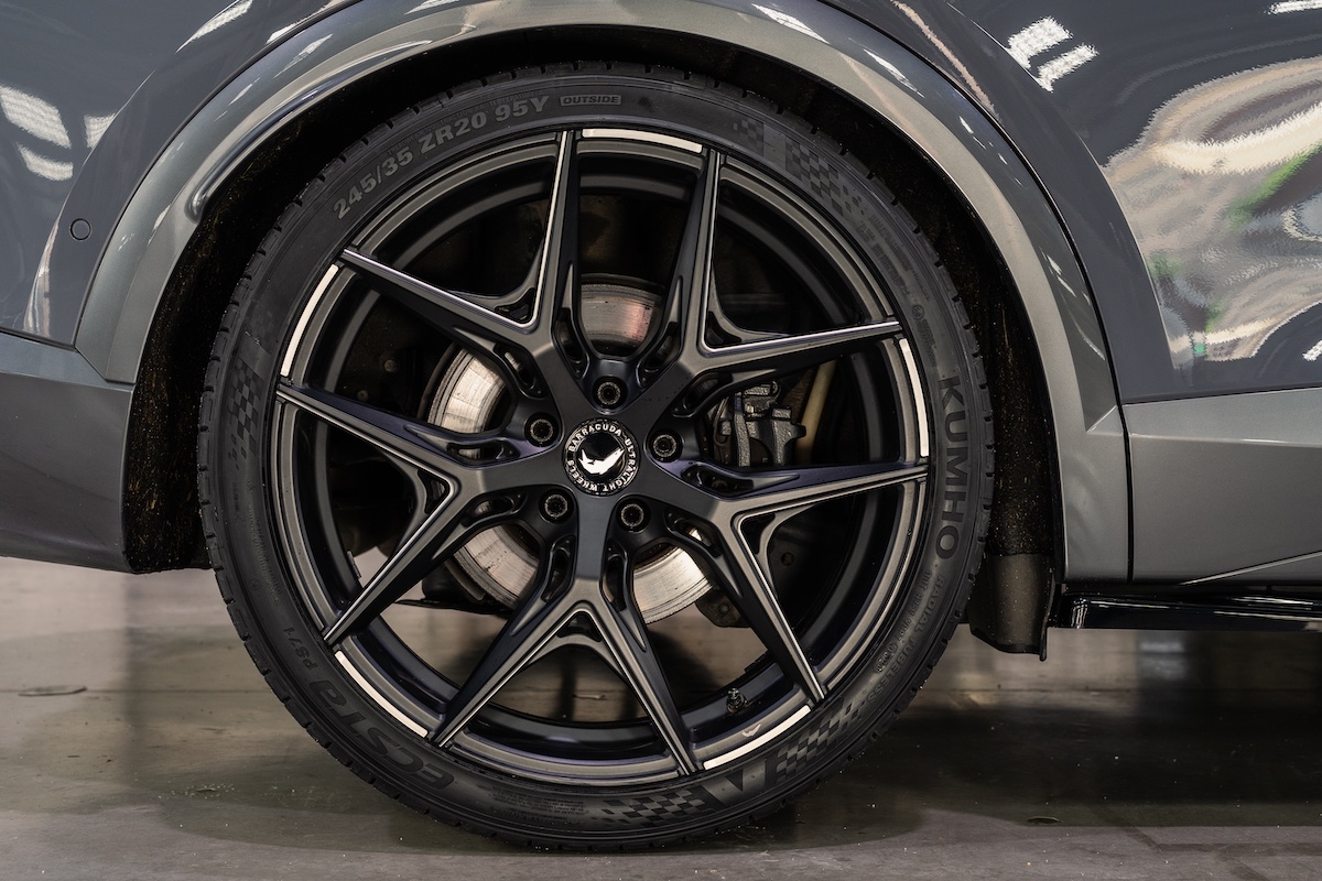 Dies stellt einmal mehr das hiermit präsentierte Exemplar des sportlich-dynamischen SUVs unter Beweis. An seinen Achsen sind die Razzer rundum in den Dimensionen 8,5×20 Zoll installiert. Die Bereifung misst 245/35ZR20 und mit ihrem Finish in mattem Schwarz mit gefrästen Konturen weisen die detailverliebt gezeichneten Y-Speichen-Felgen ein aufsehenerregedes Zweifarb-Styling auf. Als Mitglied von Barracudas Ultralight Series ist das Rad zudem im gewichtssparenden Flow Forged-Verfahren produziert und dementsprechend besonders leicht.