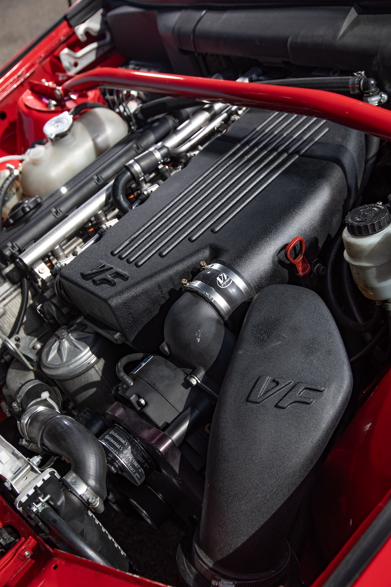 In den E30-Motorraum zog ein 3,2-Liter-Reihensechszylinder aus dem Enkel E46 M3 ein. Und damit nicht genug: E30.tv verordnete dem komplett revidierten S54B32 zusätzlich eine VF-Kompressoraufladung. So schickt der mechanisch aufgeladene M-Motor nun – je nach Mapping – bis zu 540 PS an die Hinterräder. Angesichts eines fahrfertigen Leergewichts von 1.175 Kilogramm bedeutet dies ein Leistungsgewicht von nur 2,2 kg/PS. Zum Vergleich: Ein aktueller M4 CS schleppt mehr als 3,3 kg/PS mit sich herum – 50 Prozent mehr Gewicht pro PS! Aus seinem Spenderfahrzeug brachte der S54-Motor auch gleich ein manuelles 6-Gang-Schaltgetriebe mit.