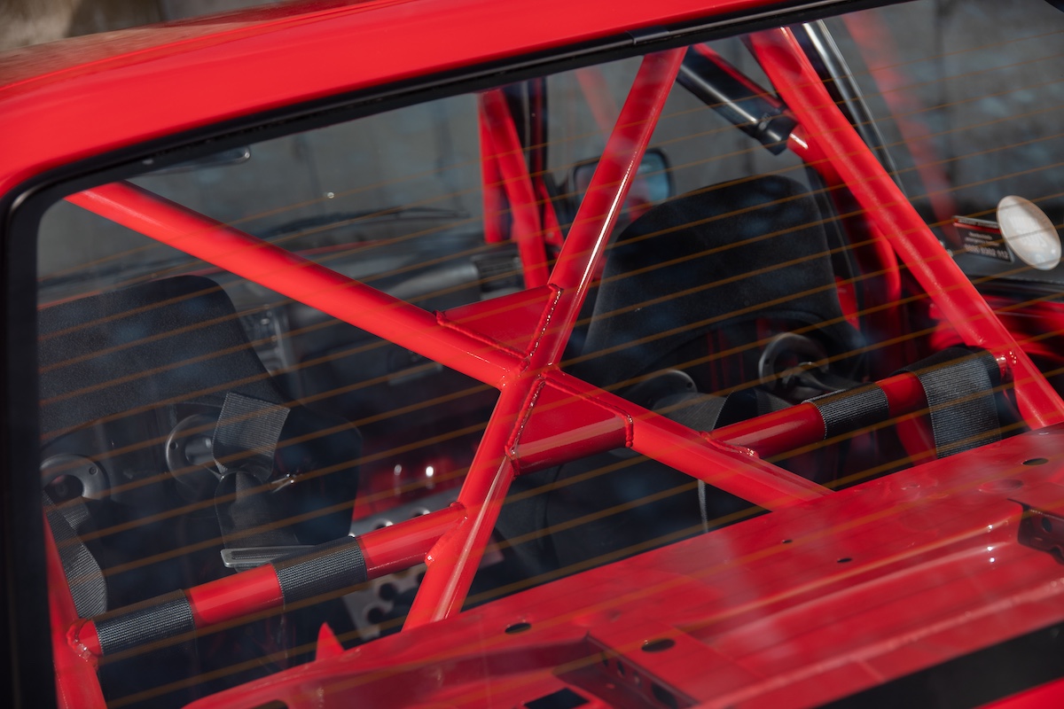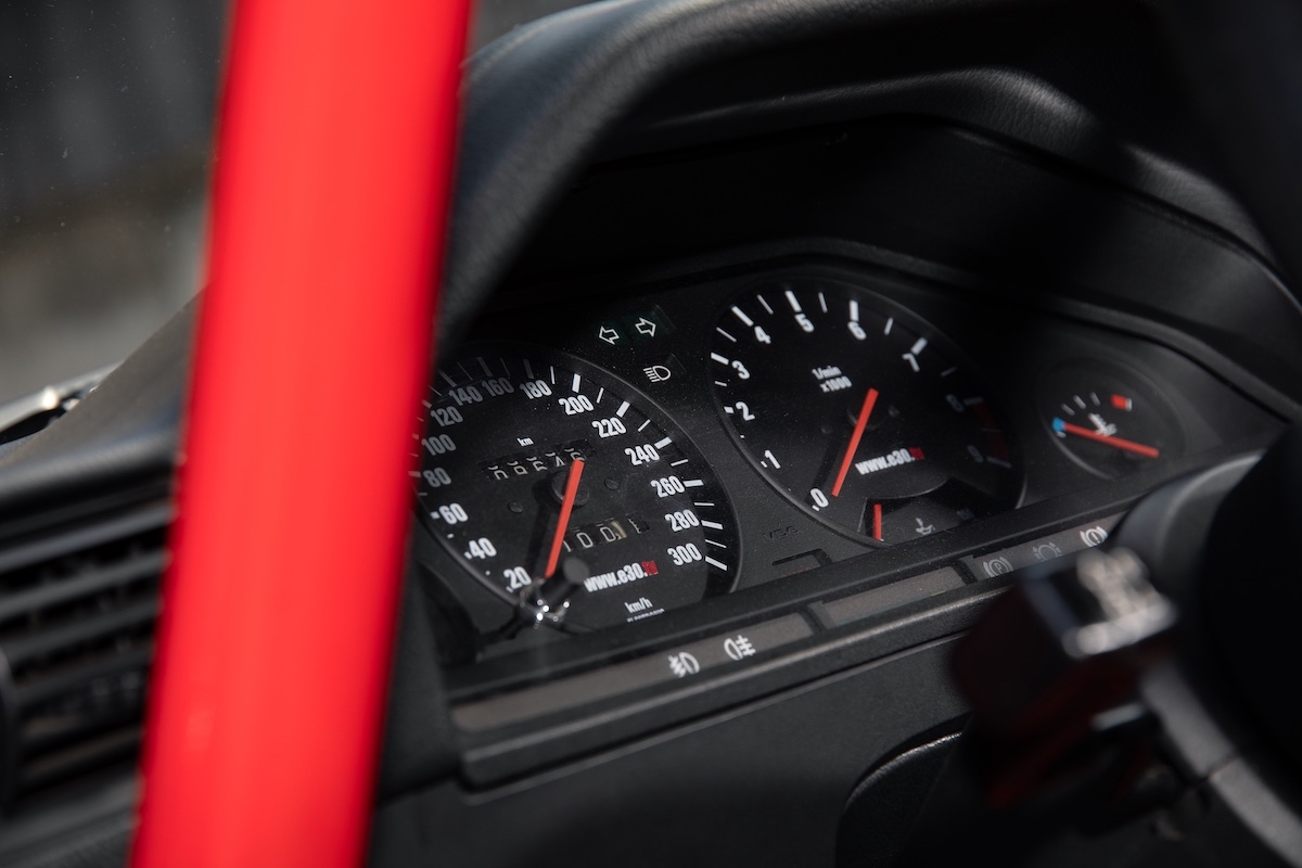Auch im Innenraum des BMW stehen die Zeichen natürlich auf Motorsport: Vor dem Aufbau der Karosserie schweißte Allkofer Rennsporttechnik eine massive Sicherheitszelle in die E30-Struktur ein, welche heute zwei Recaro Pole Position-Schalensitze mit Schroth-Gurten umschließt. Während Hape am tief geschlüsselten Sportlenkrad dreht, wirft er die Gänge mittels eines hoch aufragenden CAE-Shifters ein. Zwar entfielen diverse Teppiche und Dämmstoffe, das E30-Armaturenbrett blieb jedoch erhalten. Die Türverkleidungen bestehen aus Carbon.