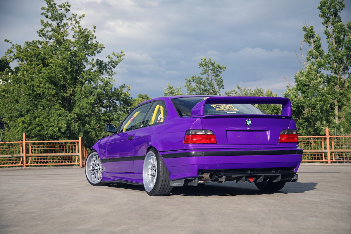 Ein sehr populäres E36-Tuning-Upgrade ist dazu der mit Distanzstücken erhöhte 318is Class II-Style-Heckflügel. Foliert ist das einst in biederem Sterlingsilber ausgelieferte BMW-Coupé jetzt in krassem „Plum Explosion“ von 3M – zu Deutsch: Pflaumen-Explosion – welches diesem Namen mit seinem leuchtenden Lila alle Ehre macht.