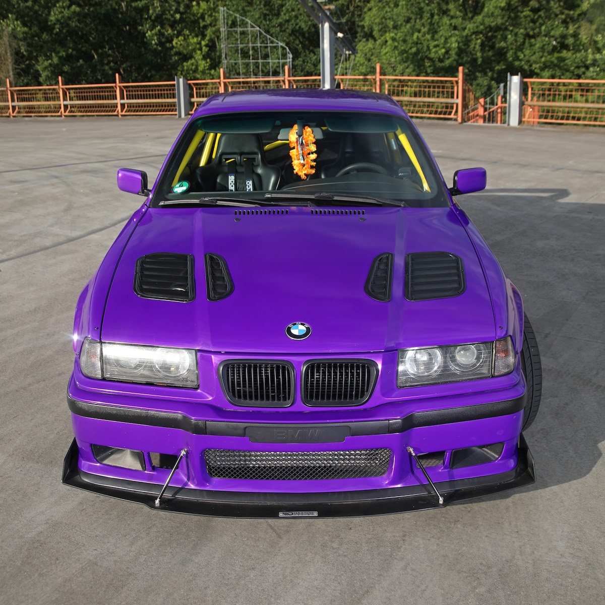 Karosserie: M Paket nachgerüstet, Musk Customs-Verbreiterungskit, Maxton Design-Frontspoilerschwert und -Heckdiffusor, Motorhaube mit Luftauslässen, 318is Class II-Style-Heckflügel mit Distanzstücken, Folierung in „Plum Explosion“
