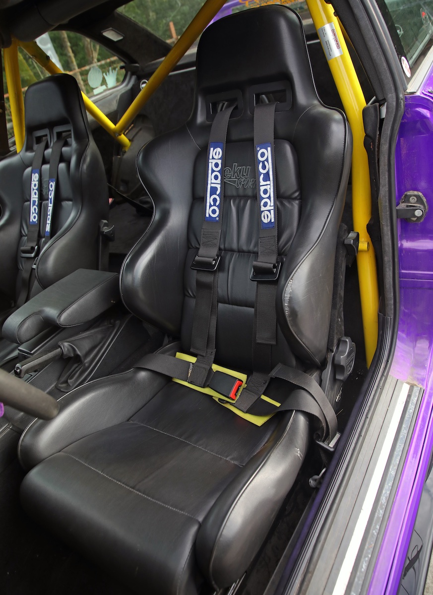 Innenraum: Wiechers-Überrollkäfig, geschüsseltes Momo-Lenkrad, eku-Sportsitze, Sparco-Hosenträgergurte, Alcantara-Imitat-Himmel, TFT-Headunit, Heckausbau mit Subwoofer statt Rücksitzbank