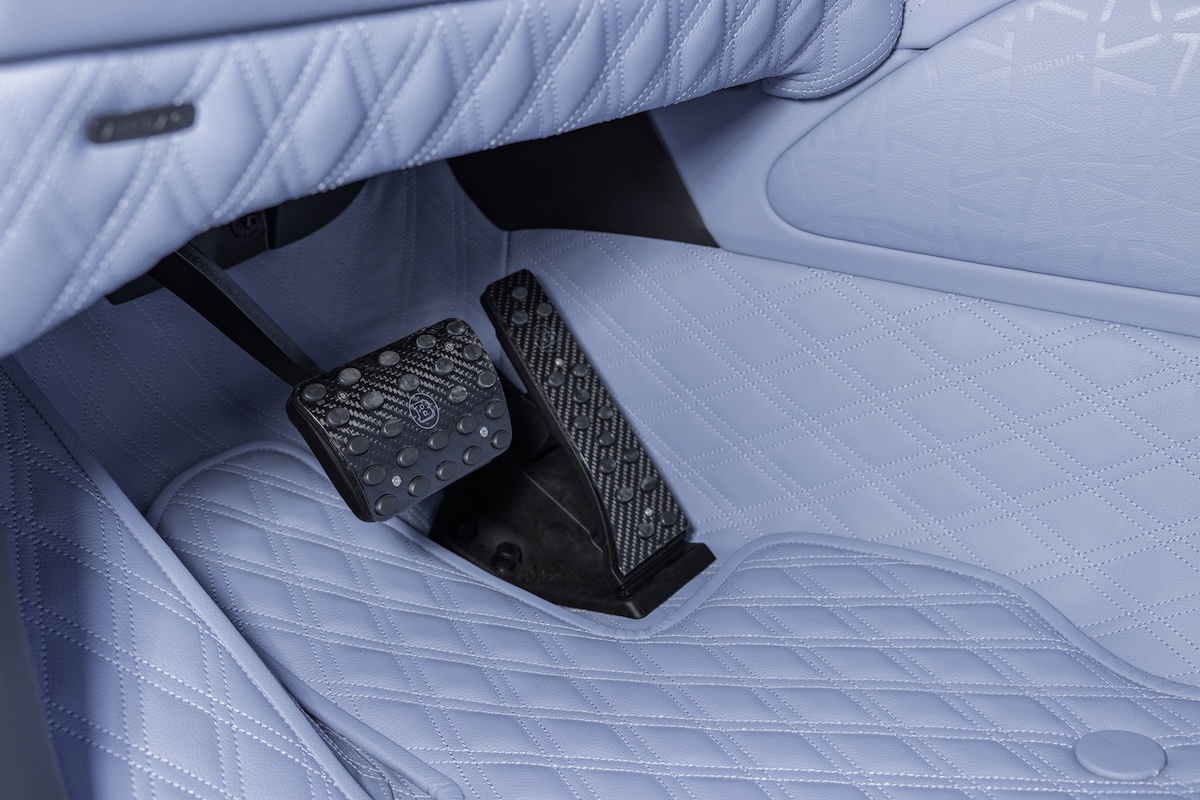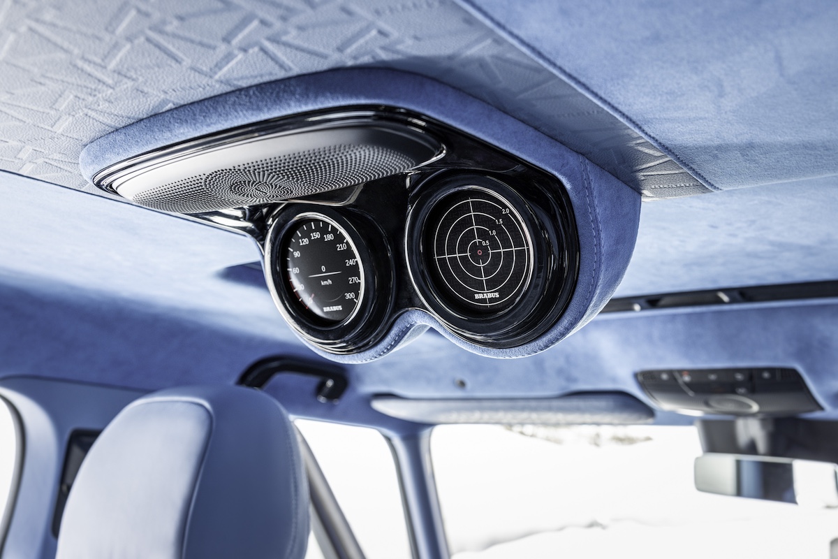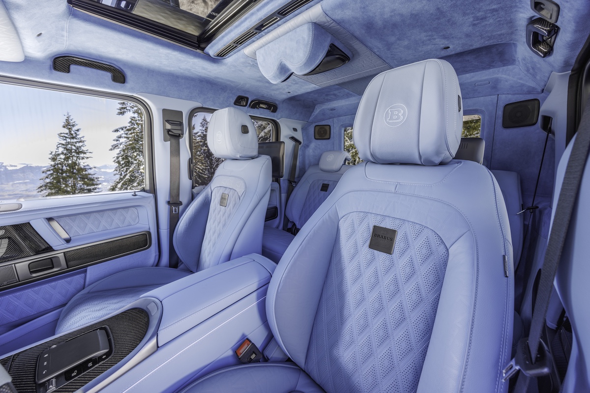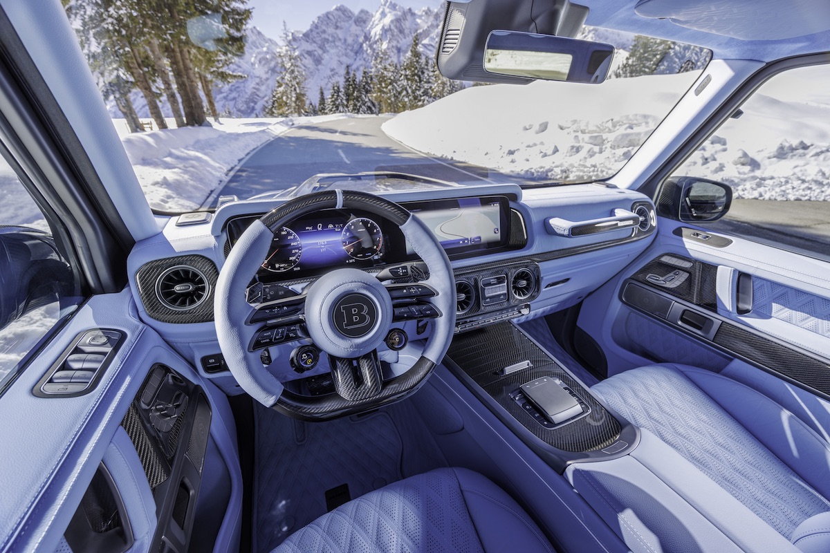Unter der Haube geht’s ab – dank eines fetten Upgrades des Vierliter-Biturbo-V8 mit Hochleistungs-Turbos und mehr. So liegen verrückte 800 PS und 1.000 Nm an. So beamt sich der XXL-AMG in 4,8 Sekunden auf 100 km/h. Und das, obwohl er noch gigantischer ist als in Serie. Der Grund? Brabus machte den G 63 einfach mal zum Hardcore-Pick-up. On top kam ein typischer Brabus-Widebody-Kit – mit massig Carbon, logisch! An den Achsen: riesige 9,5×22-Zoll-Monoblock HD-Felgen. Die 325/55er All-Terrain-Bereifung lässt den XLP 800 erbarmungslos durchs Gelände pflügen. Zumal das Fahrwerk mit Portalachsen für absurde Bodenfreiheit sorgt. Das Interieur ist ein majestätischer Palast. Es rockt eine individuelle Leder-Neuausstattung in markanten „Sky Blue“, Carbon en masse und mehr.