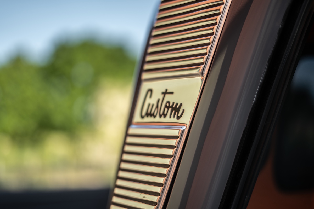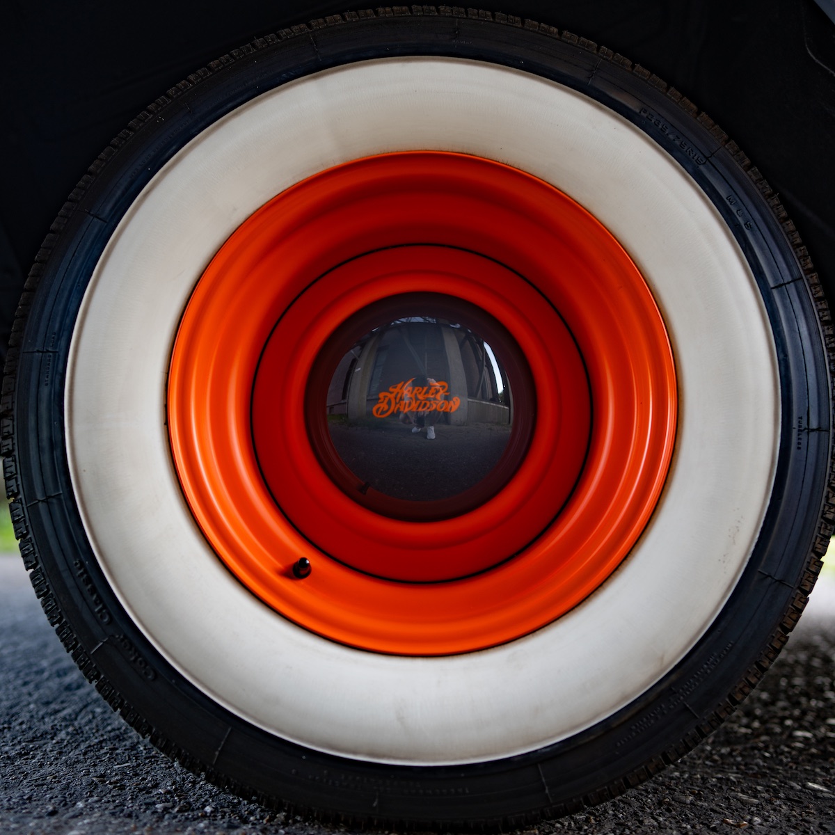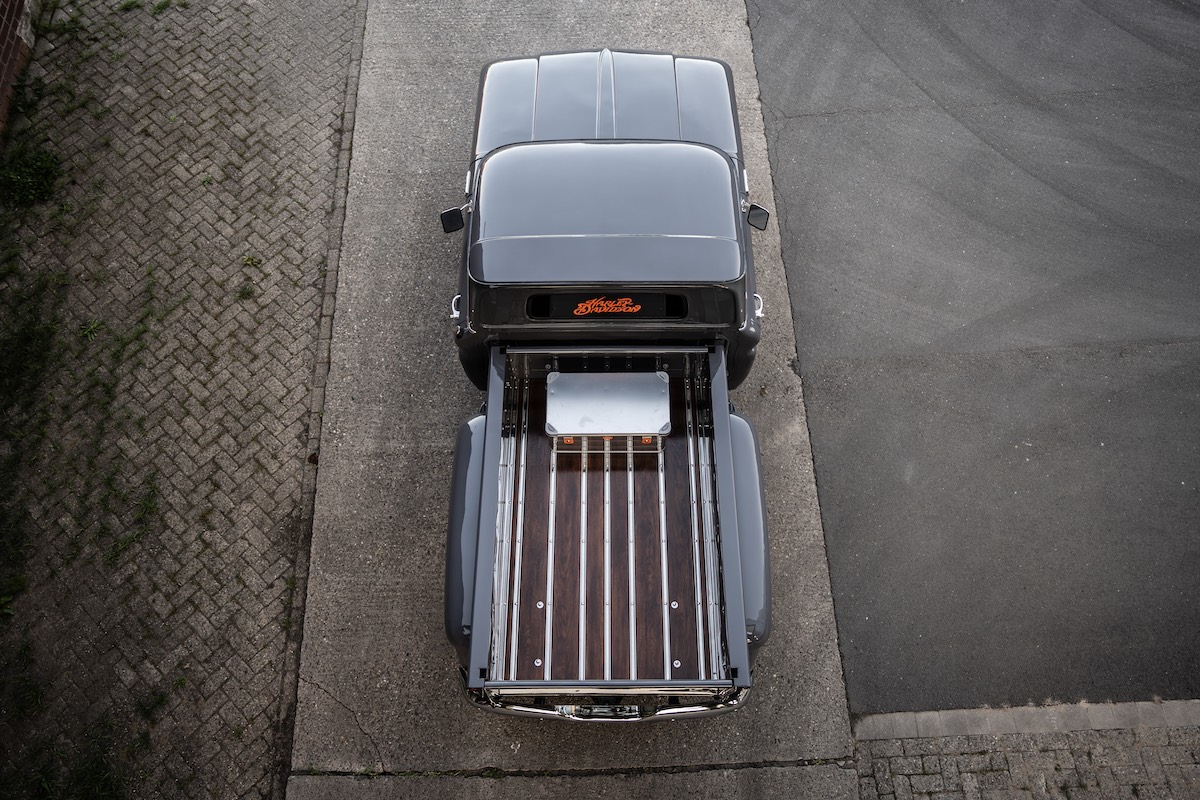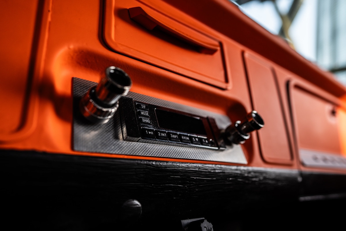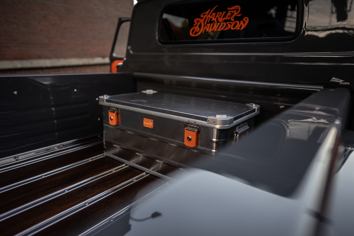 Im Rahmen dieser blieb kein Stein auf dem anderem. Karosserie und Innenraum wurden komplett auseinandergenommen und bei der Gelegenheit einige Teile gänzlich erneuert. Abschließend erhielt die Karosse eine frische Lackierung in Graphene Grau. Hinzu kommen orangefarbene Akzente wie die mit 235/75er Reifen besohlten 15-Zoll-Felgen oder die Harley-Davidson-Schriftzüge. Schließlich ist Torsten auch leidenschaftlicher Biker, in dessen Garage zwei Motorräder der kultigen US-Marke stehen. Der Innenraum wurde ebenfalls entsprechend veredelt. So sind das Armaturenbrett und Dachhimmel sowie -säulen orange ausgeführt. Zwar schmeichelt auch das schicke Lenkrad mit Holzkranz dem Auge. Doch das wahre Highlight ist trotzdem die Sitzbank. Sie ist aufbereitet und neu mit schwarzem Leder bezogen samt perfekt gesetzter orangefarbener Steppnähte in Rautenform.