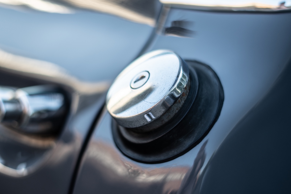 Karosserie: komplett restauriert, Neulackierung in Graphene Grau von Cupra, Harley-Davidson-Schriftzug auf der Heckscheibe