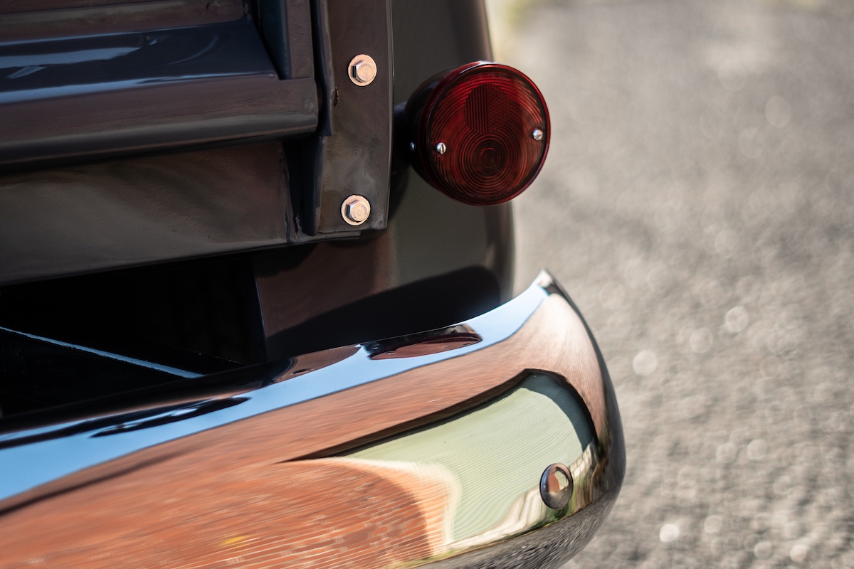 Innenraum: komplett restauriert, Drei-Speichen-Lenkrad mit Holzkranz, Schalthebel mit Totenkopf als Schaltknauf, Armaturenbrett und weitere Teile des Innenraums orange lackiert, Sitzbank neu bezogen mit schwarzem Leder samt orangefarbener Rauten-Steppnähten, Dachhimmel schwarz lackiert