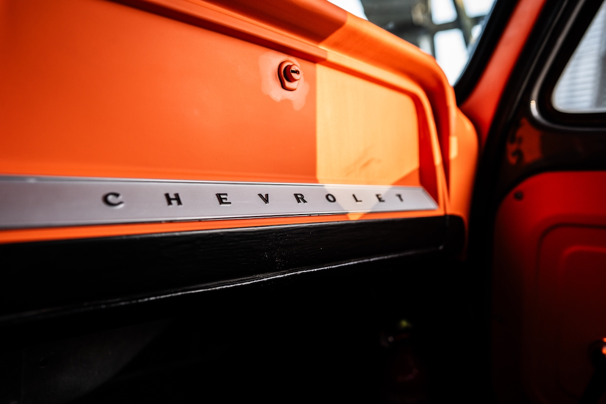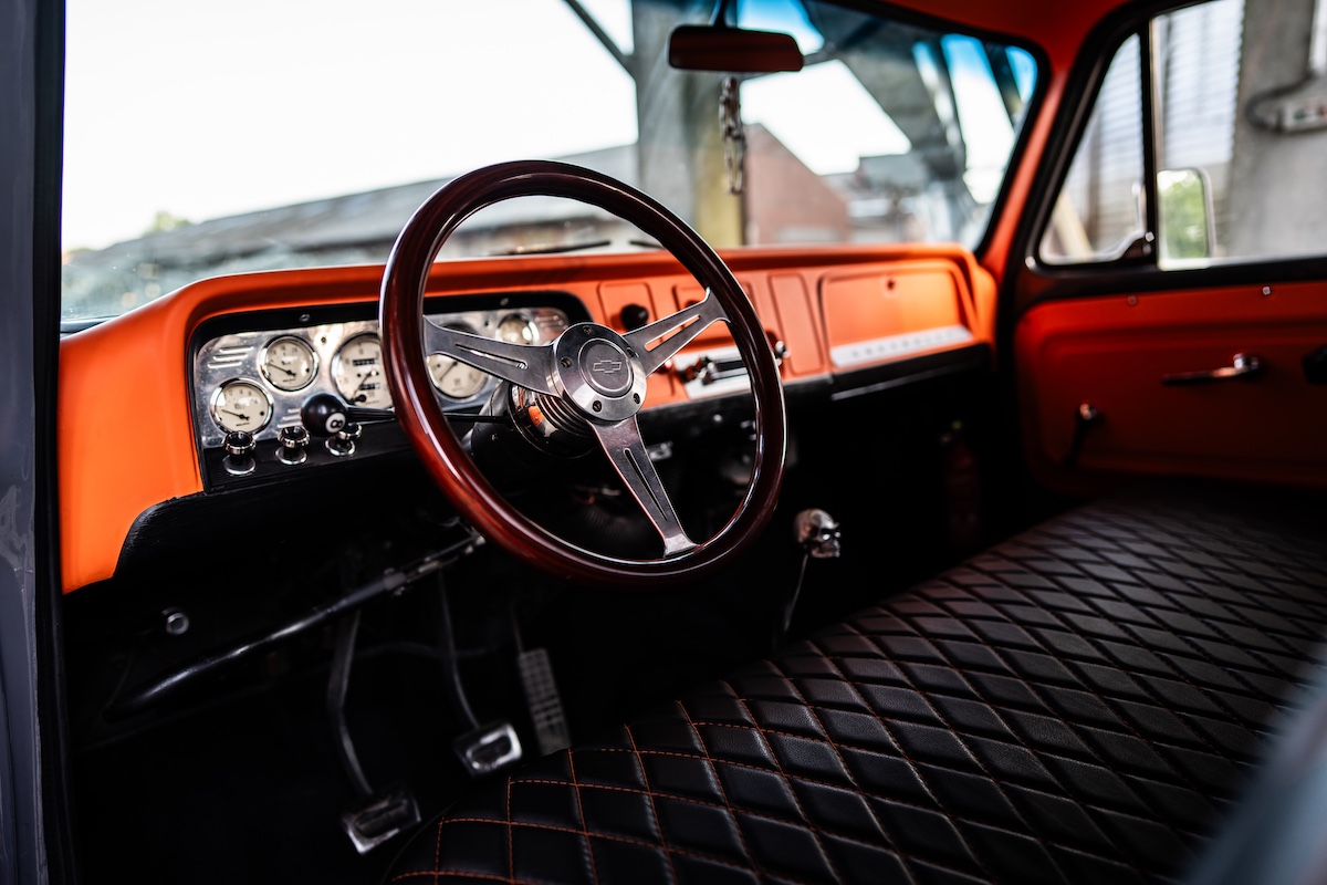 Im Bug sitzt ein 5,7-Liter-V8, der technisch wie optisch überzeugt. Etwa 300 PS generiert er dank mehrerer Edelbrock-Komponenten – Vergaser, Ansaugbrücke und Luftfilter – sowie einer Custom-Abgasanlage mit Fächerkrümmer. Deren 2,5-Zoll-Verrohrung und Flowmaster-Schalldämpfer kamen gerade ganz frisch an Bord. Classc Mobile Schettler installierte sie noch in einem, als der Truck kürzlich zur finalen TÜV-Abnahme dort war. Denn selbstverständlich besitzt der C10 nicht nur eine ordnungsgemäße Zulassung, sondern zudem ein H-Kennzeichen. Schließlich war es Torsten wichtig, nicht allzu sehr vom Serienzustand abzuweichen. Nur kurz nach der finalen Fertigstellung musste er den tollen Truck übrigens aus privaten Gründen leider schon wieder abgeben.