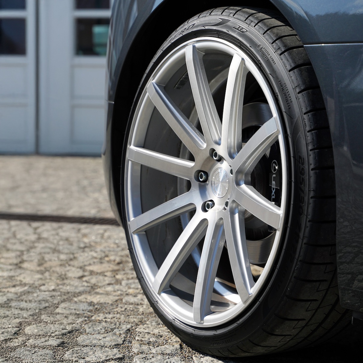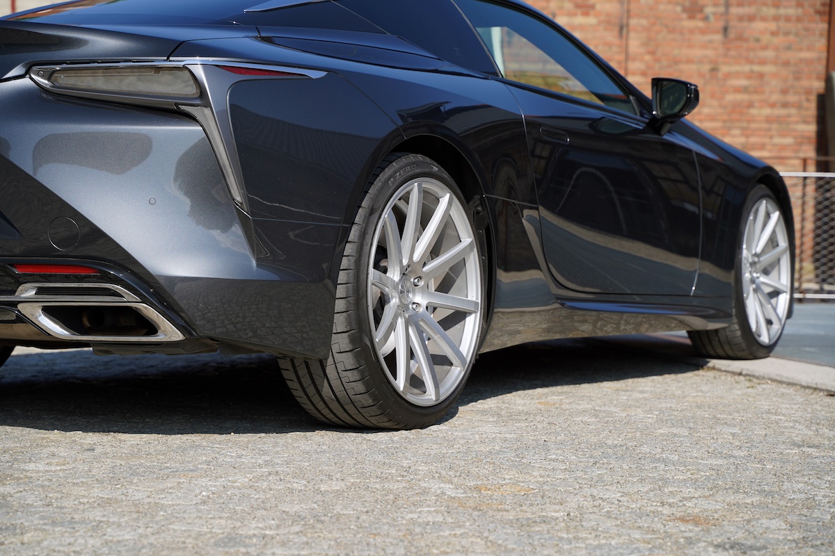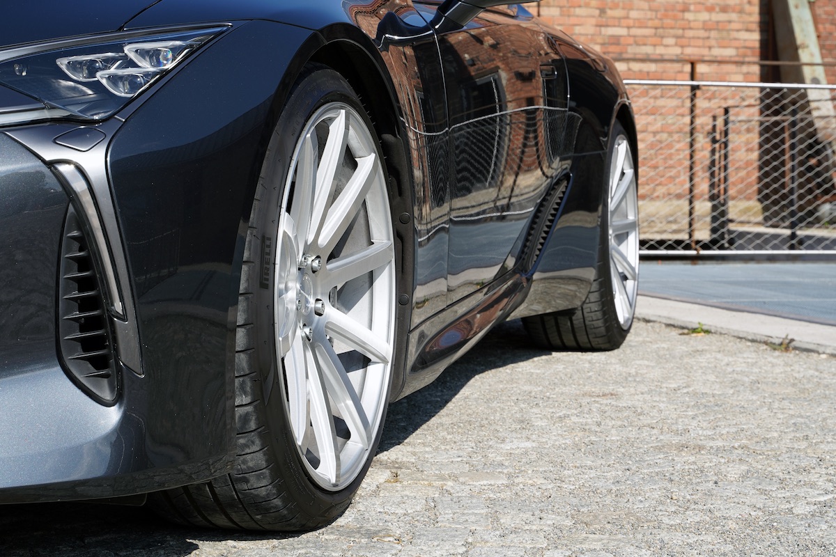 Um genau diese Variante handelt es sich bei dem hier gezeigten Exemplar, das mit einem Satz hochwertiger Cor.Speed Sports Wheels verfeinert wurde. Die Wahl fiel auf die populären Deville-Räder im klassischen Finish Silver Brushed. Mit ihren zehn kraftvoll gezeichneten, gradlinigen Speichen passen die Felgen optisch perfekt zur zugleich sportlichen und eleganten Linienführung des Lexus-Coupés. Ferner begeistern sie mit ihren beeindruckenden Dimensionen. Vorne steht der LC 500 auf der 9,5×22 Zoll messenden Deep Concave-Variante, bei den 10,5×22-Zöllern an der Hinterachse fällt die Konkavität gar noch extremer aus. Die zugehörige Pirelli P Zero-Bereifung misst 255/35ZR22 und 295/30ZR22.