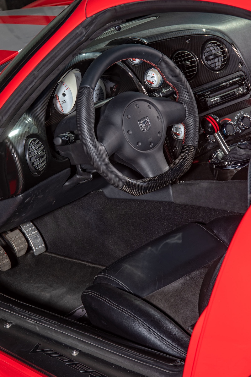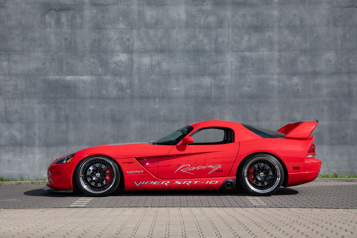 Den gewaltigen 8,3-Liter-V10 im langen Viper-Bug ließ Michael in Ruhe. Kein Wunder, benötigt der frei saugende Zehnzylinder angesichts von gut 500 PS und mehr als 700 Nm doch nun wirklich keine Leistungssteigerung. An Bord kam allerdings eine Corsa Performance Cat Back-Sidepipe-Abgasanlage, welche dem Hubraumriesen nun auch einen adäquaten Sound verleiht.