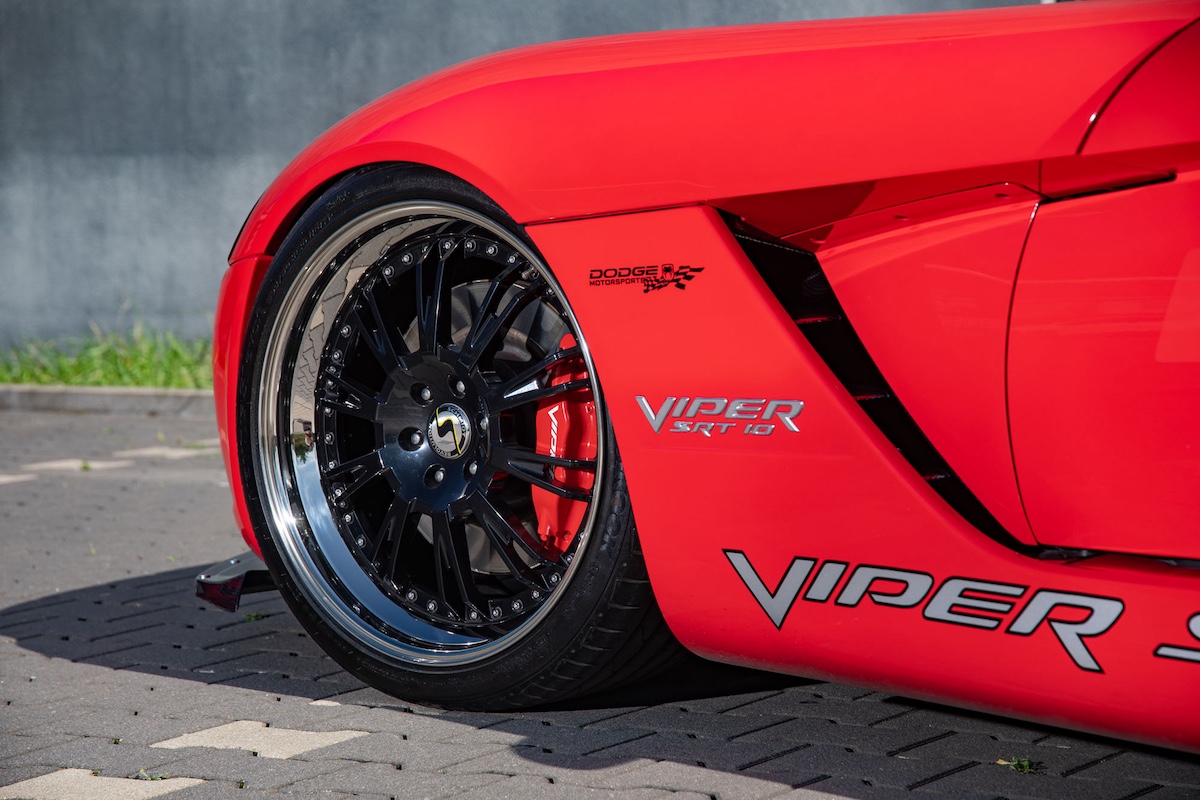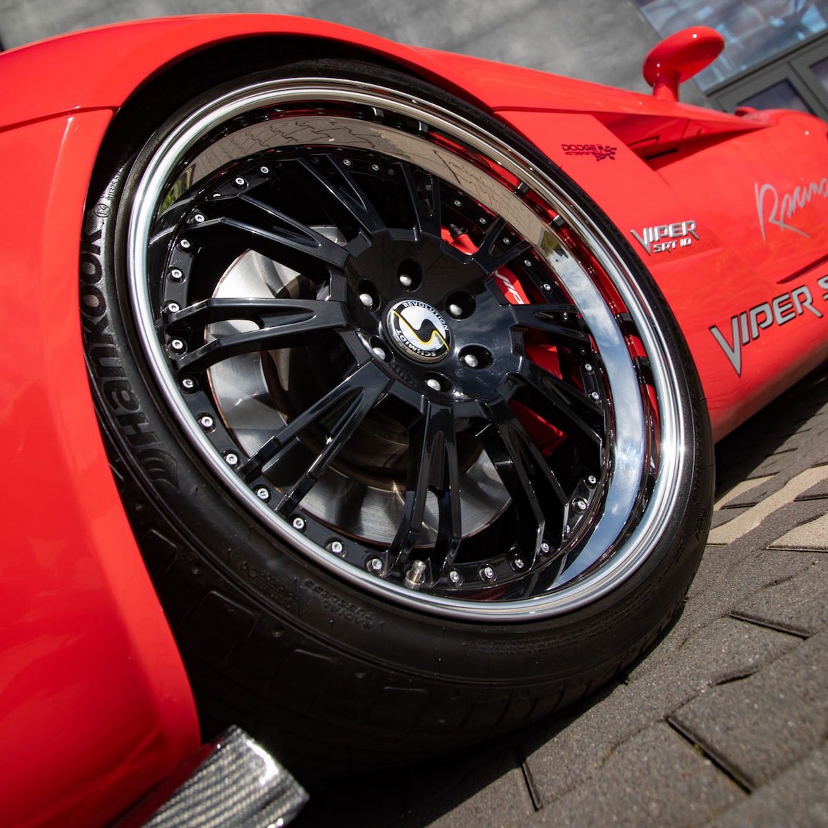 Für ein Plus an mechanischem Grip sowie eine augenfällige Tieferlegung zeichnet darüber hinaus ein KW Variante 2-Gewindefahrwerk verantwortlich. Apropos Grip: Passende Räder für eine Viper zu finden, ist schon aufgrund ihrer exotischen 6-Loch-Anbindung und der XL-Dimensionen gar nicht so einfach. Michael wurde bei Schmidt fündig und montierte dreiteilig verschraubte Schmidt DG-Line-Schmiedefelgen mit schwarzen Sternen und auf Hochglanz polierten Radinox-Stufenbetten, die trotz ihrer 11×20 und 13×20 Zoll mit Hankook Ventus S1 Evo2-Gummiwalzen in 295/30R20 und 345/25R20 deutlich filigraner wirken als die 18/19-zölligen OEM-Räder.