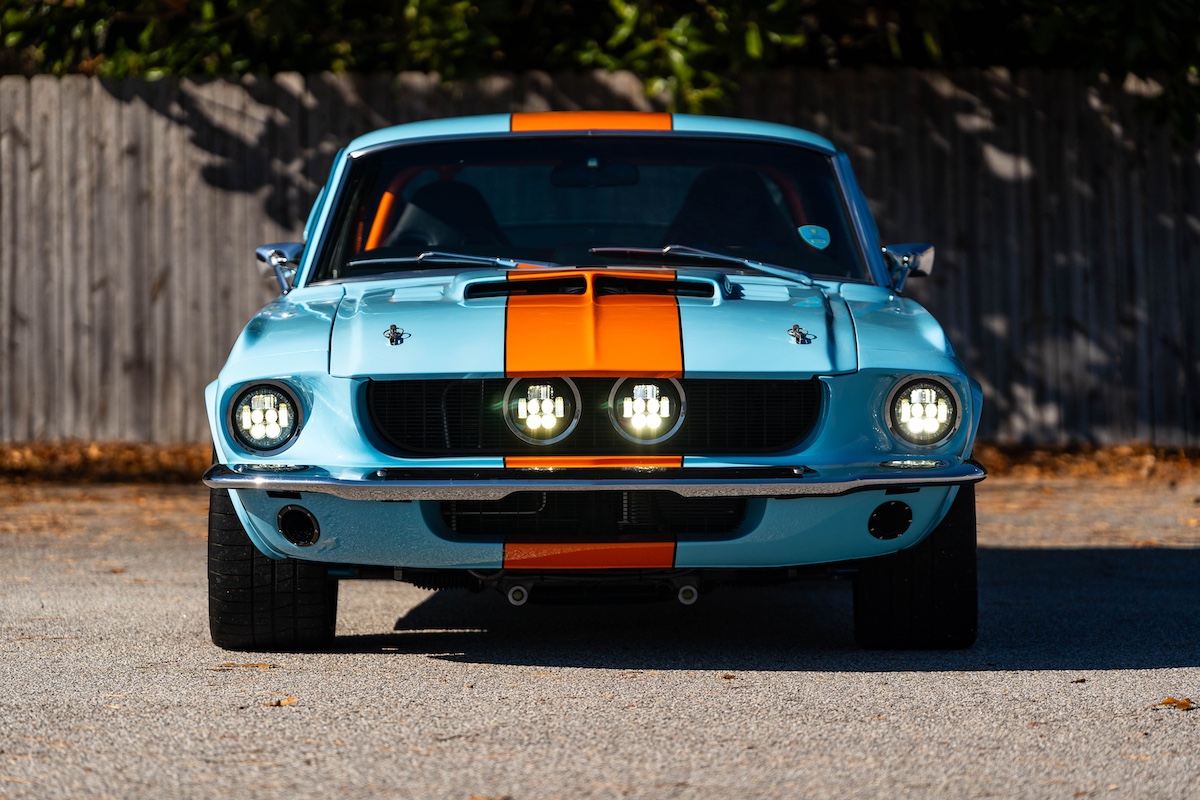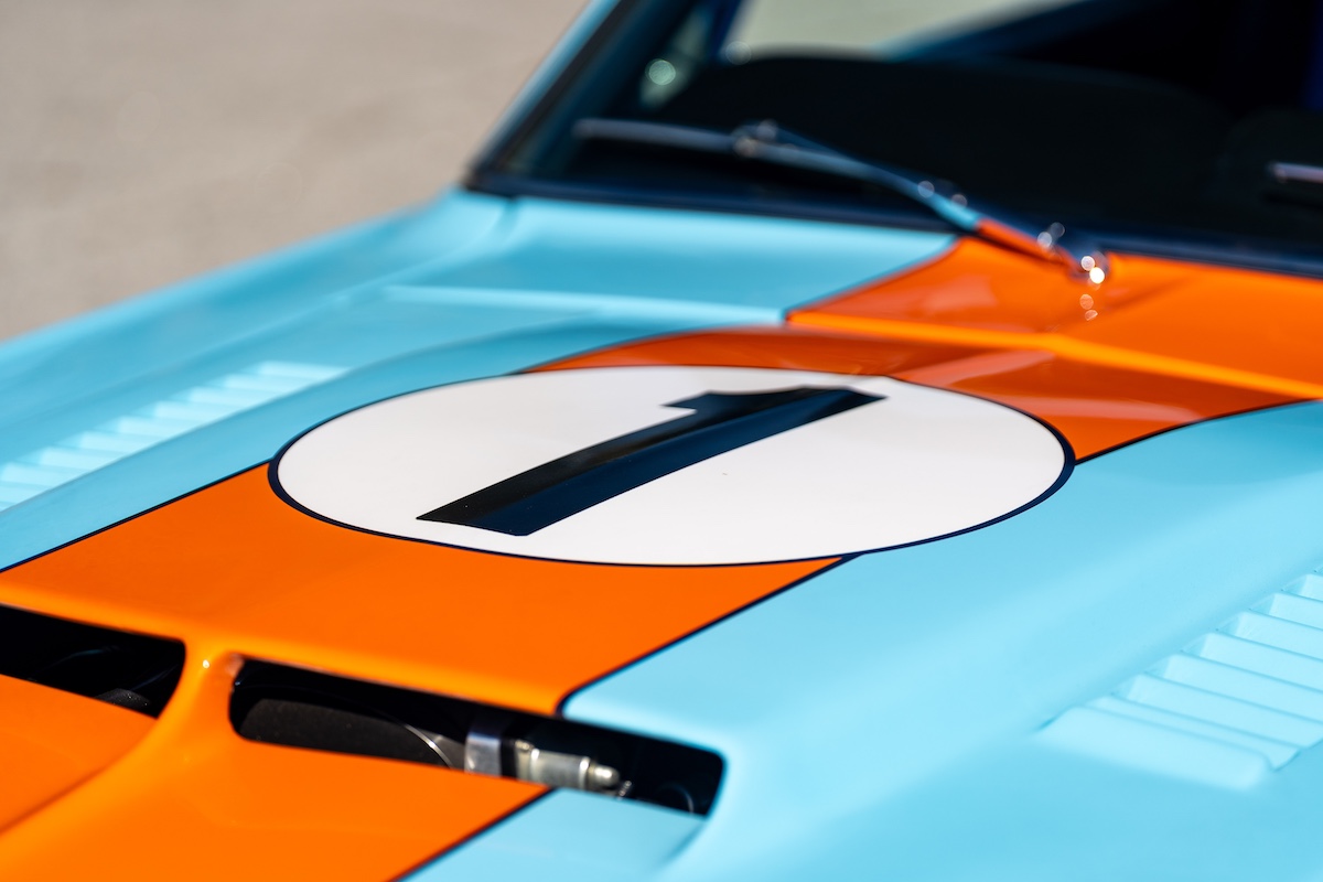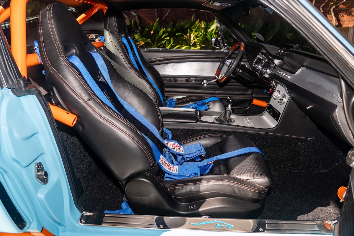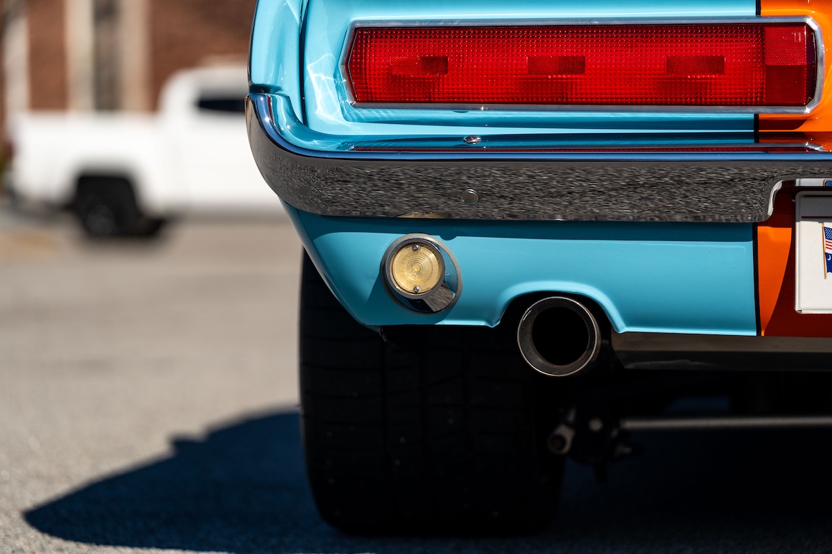 Für den heißen Auftritt ist aber nicht nur das Gulf-Design verantwortlich. Der Ford, der im Sommer über Mecum verkauft wurde, hat nämlich einiges mehr zu bieten. Er wurde einst komplett neu aufgebaut und optimiert – hier ist schon das Wort „Restomod“ angebracht. Hinter dem Umbau steckte Robert Brawn aus dem in South Carolina gelegenen Gilbert. Der sportlich-dynamische Auftritt ist im Wesentlichen der Aufrüstung mit GFK-Karosserieteilen vom 1967er Shelby Mustang zu verdanken. Noch eine Spur exklusiver wird es bei den Kotflügeln: Es sind handgefertigte Custom-Parts.