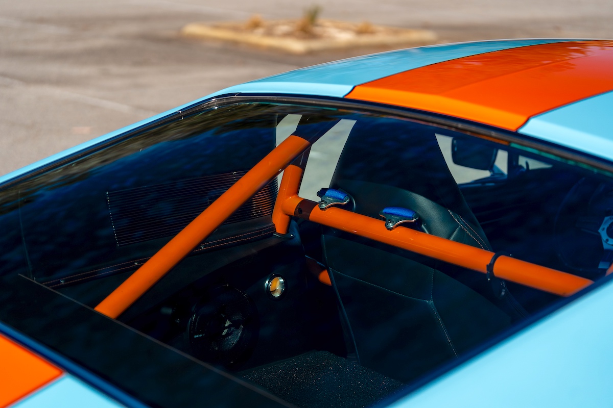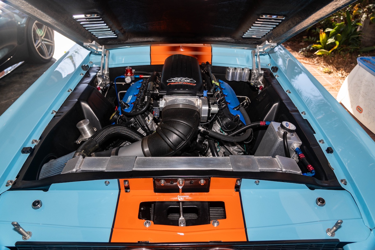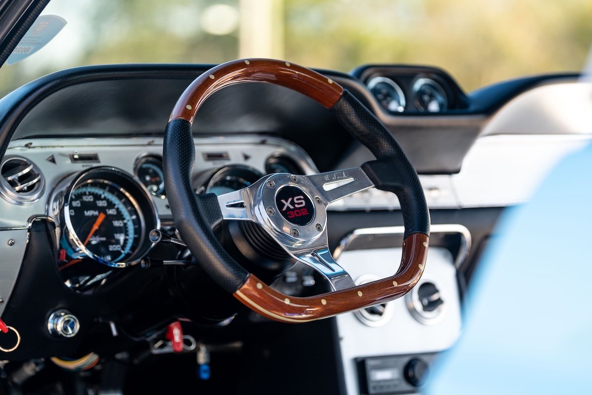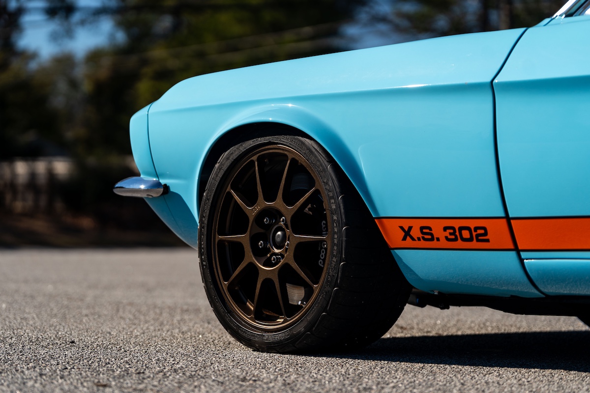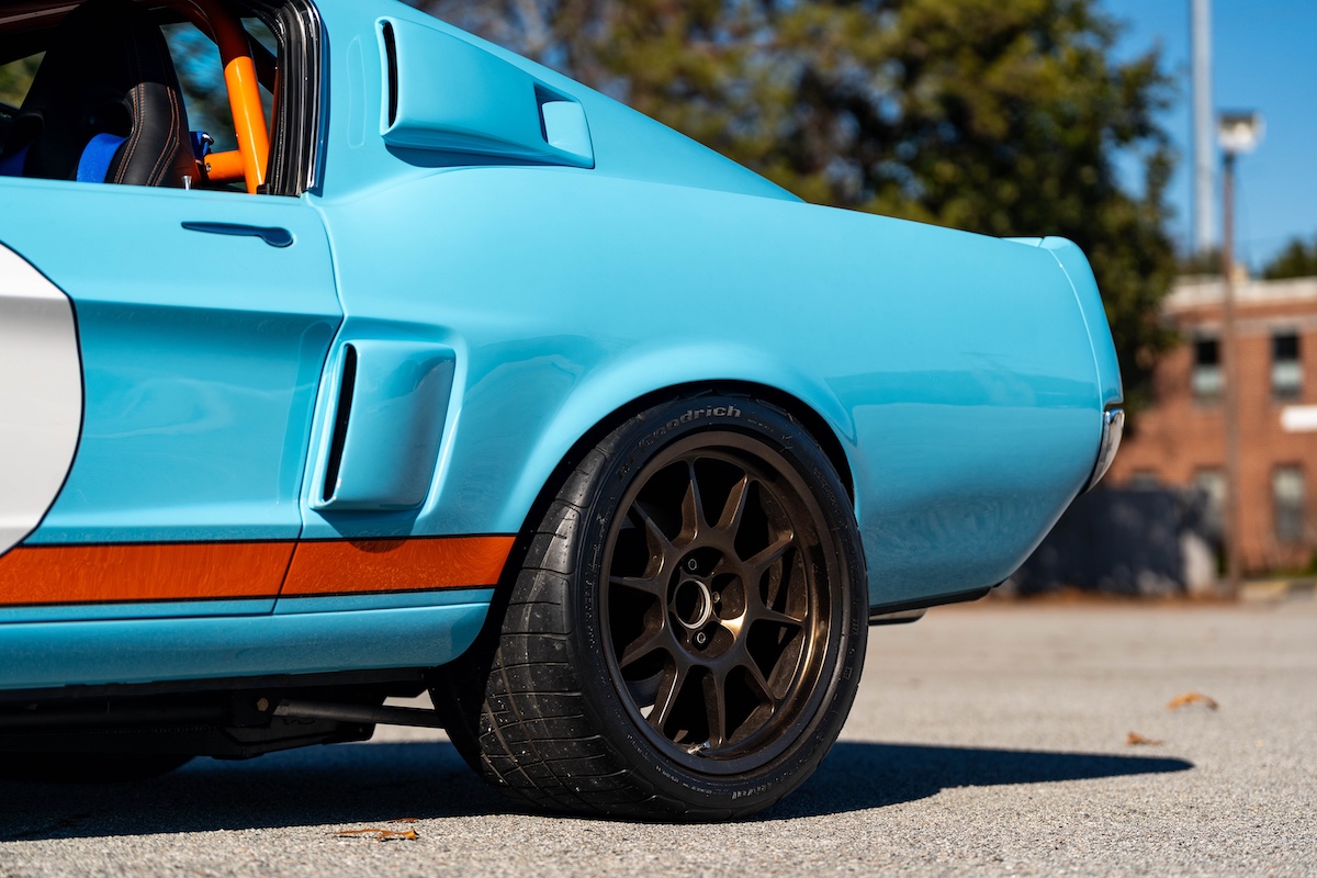Für den heißen Auftritt ist aber nicht nur das Gulf-Design verantwortlich. Der Ford, der im Sommer über Mecum verkauft wurde, hat nämlich einiges mehr zu bieten. Er wurde einst komplett neu aufgebaut und optimiert – hier ist schon das Wort „Restomod“ angebracht. Hinter dem Umbau steckte Robert Brawn aus dem in South Carolina gelegenen Gilbert. Der sportlich-dynamische Auftritt ist im Wesentlichen der Aufrüstung mit GFK-Karosserieteilen vom 1967er Shelby Mustang zu verdanken. Noch eine Spur exklusiver wird es bei den Kotflügeln: Es sind handgefertigte Custom-Parts.