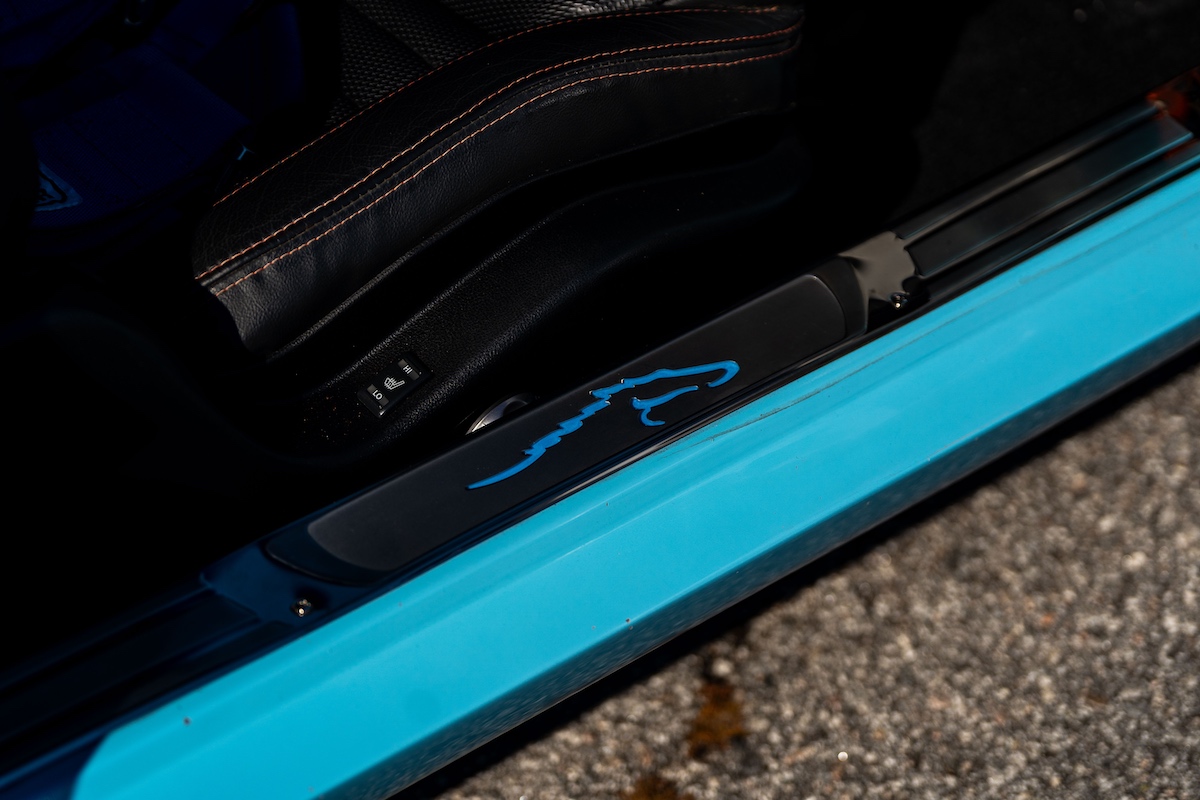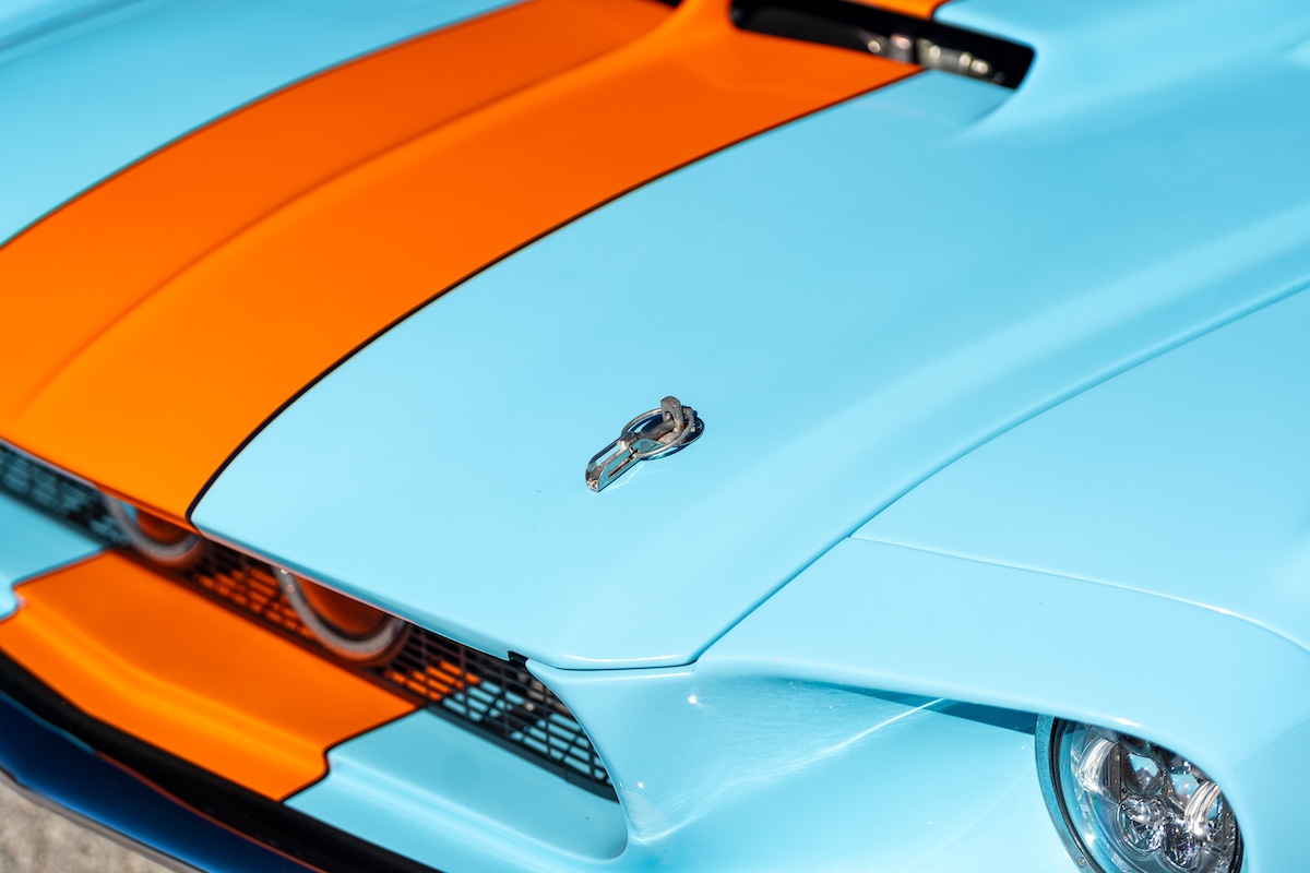 Karosserie: GFK-Karosserieteile vom 1967er Shelby Mustang, Kühlergrill mit zwei Zusatzleuchten, J.W. Speaker-LED-Scheinwerfer (vierfach), handgefertigte Kotflügel vorne, Außenspiegel mit integrierten Blinkern, bündig versenkte Kinding-It Design-Türgriffe, breite Rückleuchten vom Shelby Mustang, Verglasungen erneuert, Lackierung im Gulf-Design (hellblau und orange)