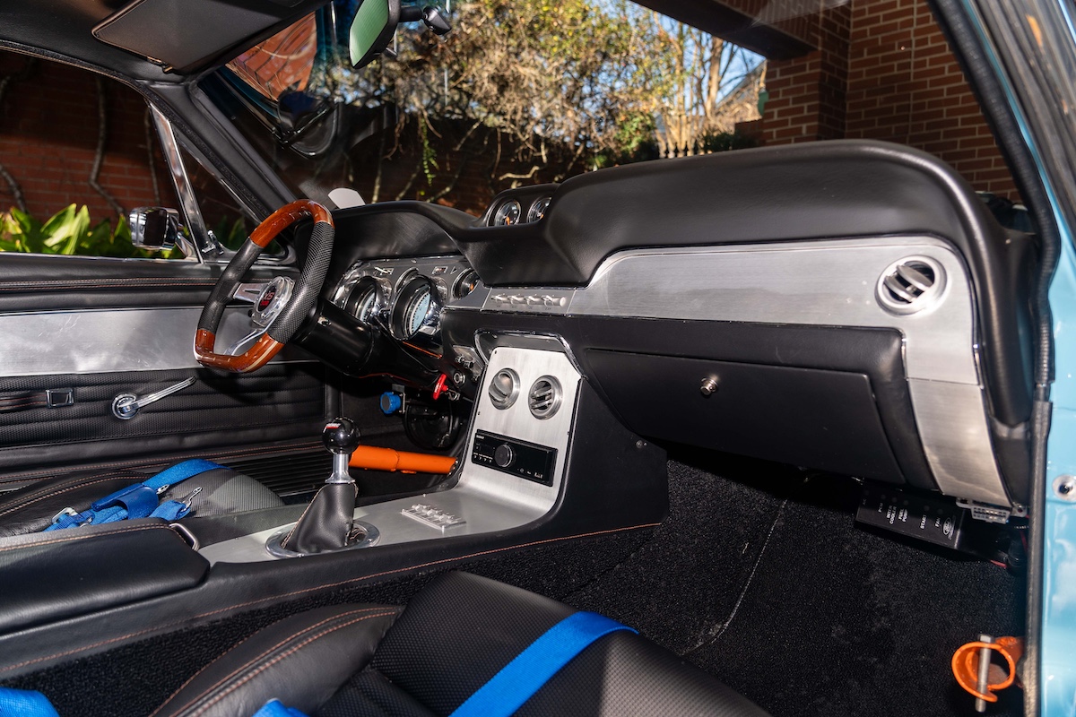 Auch das Custom-Interieur überzeugt komplett: Es zeigt moderne Upgrades, ohne den klassischen Mustang-Vibe zu verlieren. Ebenfalls unverkennbar: der Racing-Touch. Zu verdanken ist dieser vor allem dem orangefarbenen Überrollkäfig und den blauen Hosenträger-Gurten. Letztere sind mit aufgearbeiteten Recaro-Sportsitzen kombiniert. Die Rückbank? Wurde natürlich rausgeschmissen. Weitere Neuerungen sind das unten abgeflachte Nardi-Sportlenkrad, ein Mustangs to Fear-Dashboard mit Classic Instruments-Armaturen, eine sonderangefertigte Mittelkonsole und die Einstiegsleisten mit stilisiertem Mustang. Eine Feuerlöschanlage sowie Komfort-Annehmlichkeiten wie die Vintage Air-Klimaanlage, eine Sony-Soundanlage, Zentralverriegelung und elektrische Fensterheber runden diesen außergewöhnliche Mustang Fastback ab.