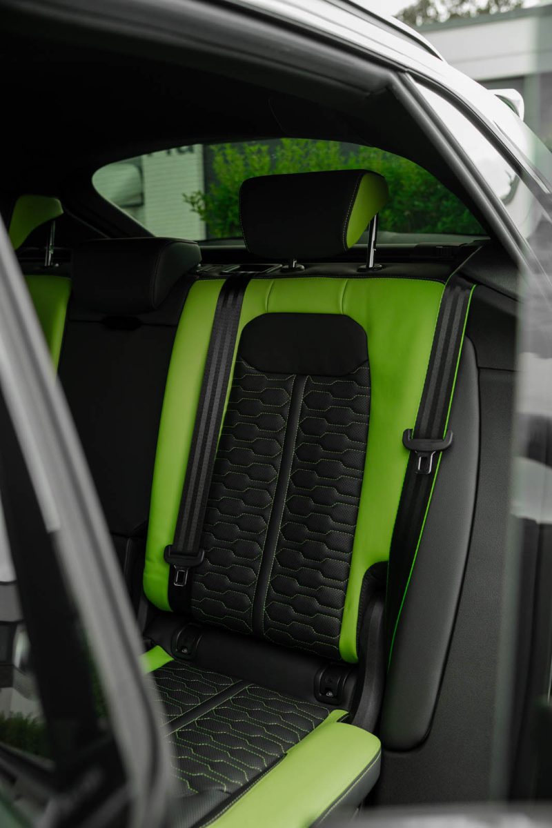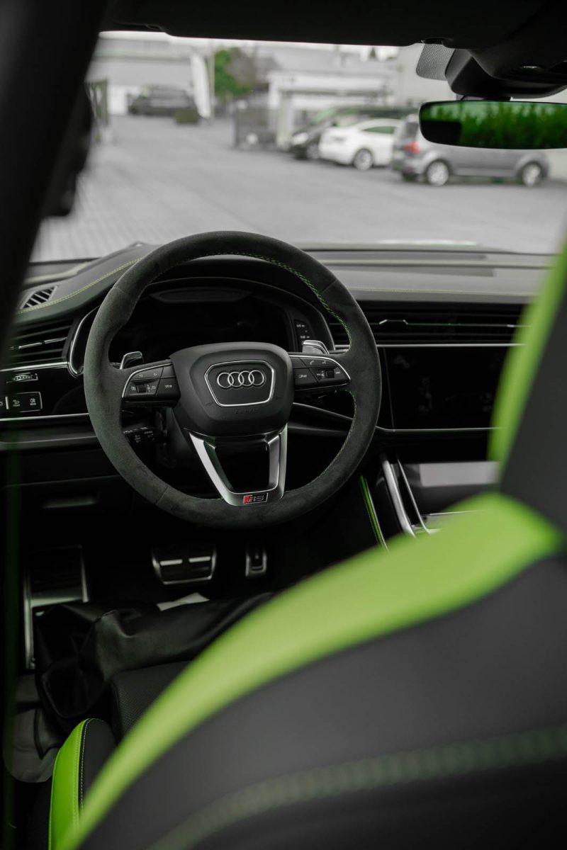 Auch farblich sorgt der Widebody-RS Q8 für Aufsehen: Weite Teile seiner Karosserie leuchten im matten Krypton Green einer PWF-Premium-Vollfolierung. Damit die Parts des Bodykits noch besser zur Geltung kommen, setzen sie sich wie weitere Bauteile in Glanzschwarz von der Karosserie ab. Und zum Schutz aller Oberflächen gab es abschließend noch eine XPEL-Lackschutz-Folierung. Ein weiteres wahres Highlight sind die Felgen: Die Wahl fiel auf ZP.FORGED 2 von Z-Performance in 10,5×23 Zoll – in zweifacher Ausfertigung, je einmal für Sommer und Winter! In der gezeigten Version für die warme Jahreszeit kombinieren die geschmiedeten Zweiteiler Sterne in Shadow Copper mit Betten in Brushed Bronze. Bei der Winter-Variante sind die Sterne Matt Black und die Betten Gloss Black gefinisht. Die sichtbaren Verschraubungen sind in beiden Fällen schwarz ausgeführt, die Bereifung misst je 295/35R23.