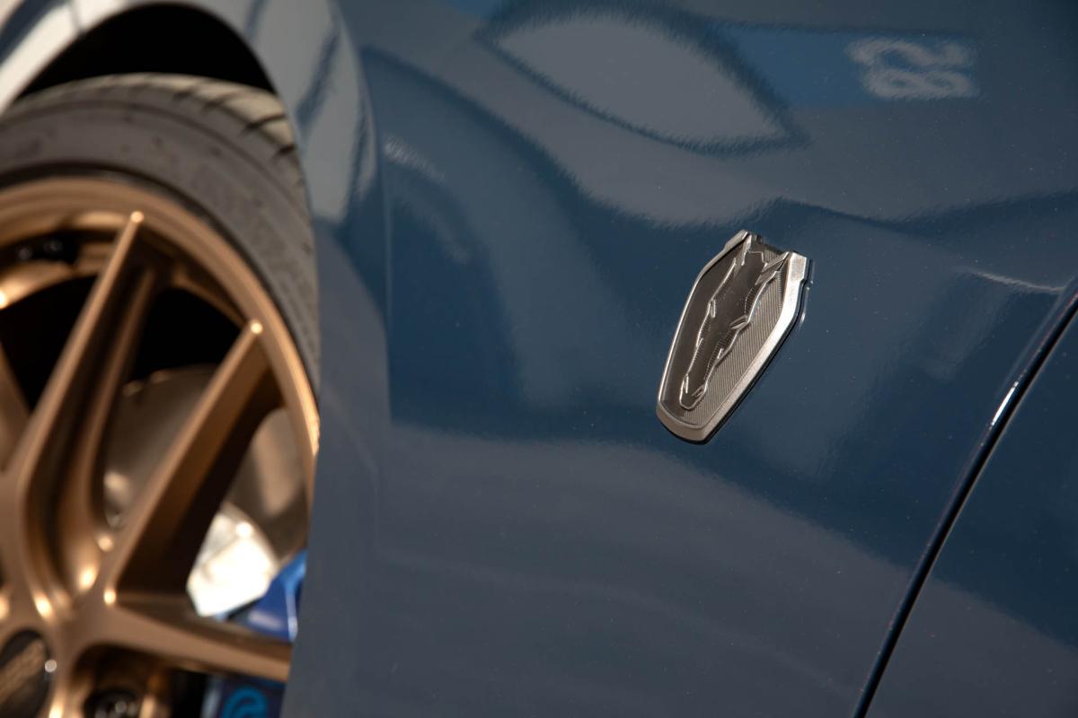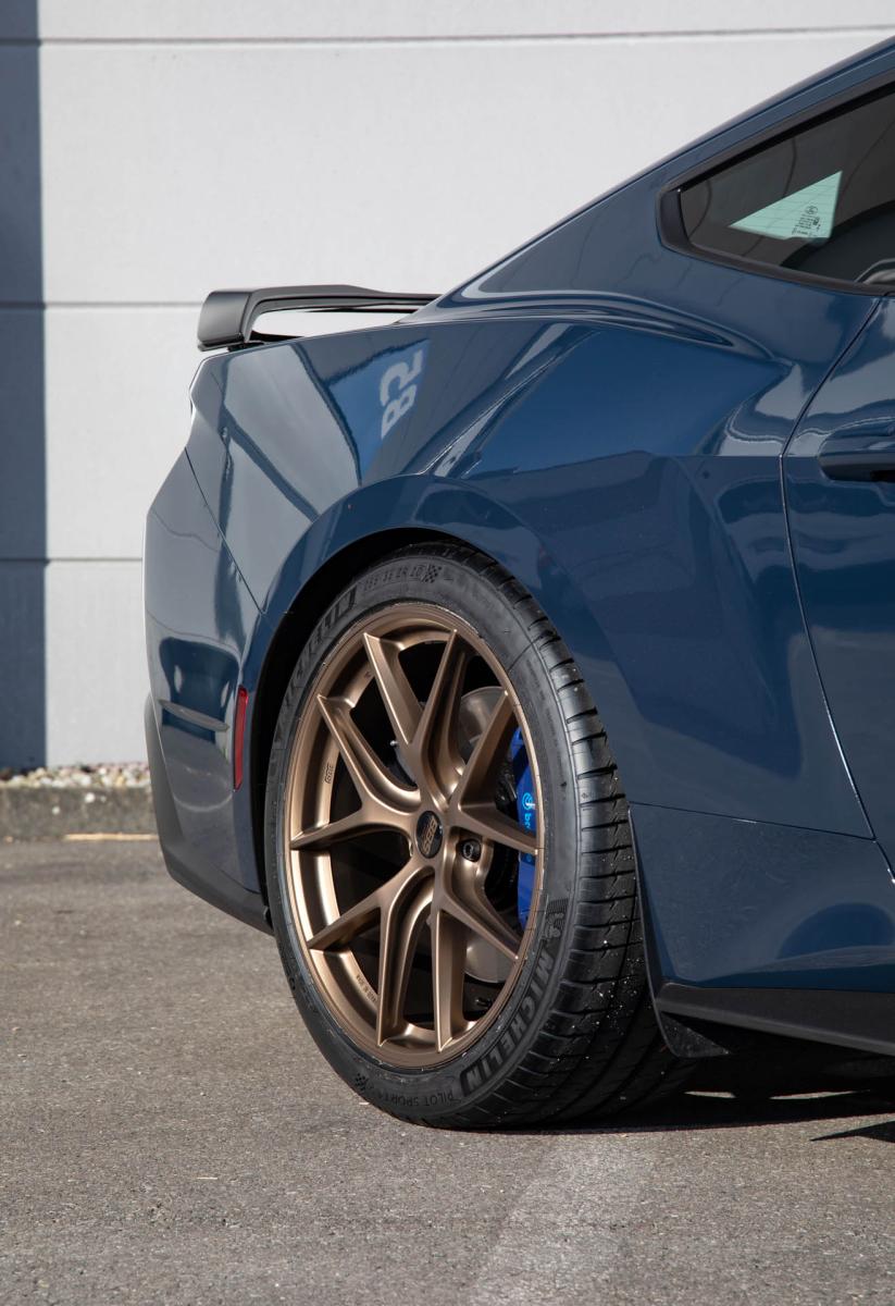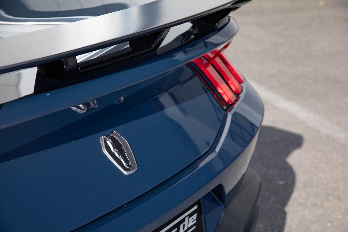Optisch trägt das 2025er Fahrzeug das absolut Dark Horse-typischste Gewand, das es gibt: Die Karosserie ist in Blue Ember Metallic ausgeführt. Dies ist jene Lackierung, welche Ford nur fürs Dark Horse anbietet und in der es daher damals auch seine große Premiere feierte. Hinzu kommen modellspezifische Details wie die schwarze Frontmaske, die Zierstreifen auf der Motorhaube und der Heckspoiler.