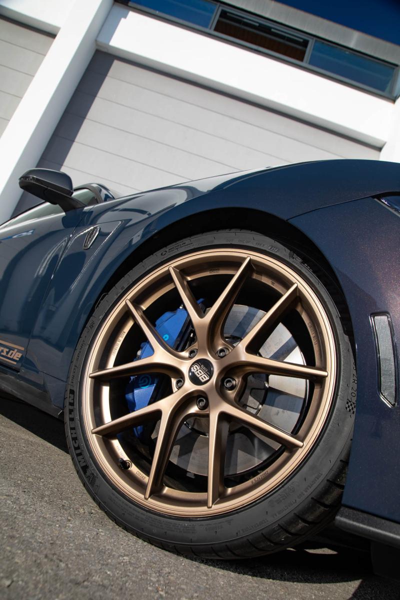Neu sind hingegen die Felgen: BBS CI-R in 9,5×20 und 10,5×20 Zoll mit griffiger 265/35er und 285/35er Bereifung. Das Finish in Bronze Seidenmatt harmoniert absolut perfekt mit der effektreichen Lackierung. Tolles Detail: Die ergänzten GeigerCars.de-Schriftzüge auf den Türen und der Fronthaube greifen die Farbe wieder auf und schlagen so gekonnt eine Brücke.