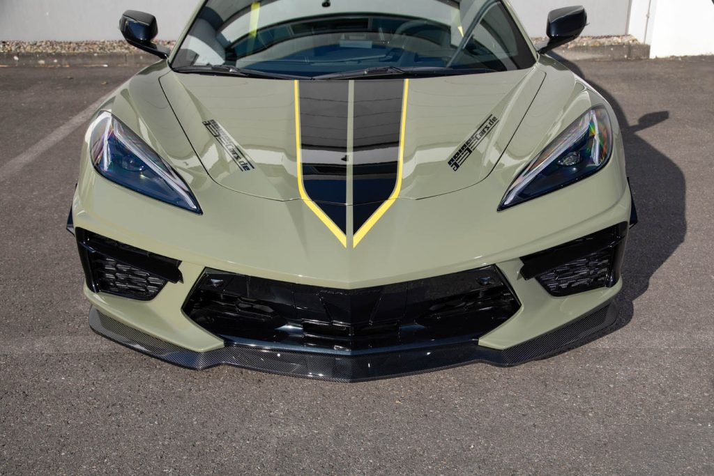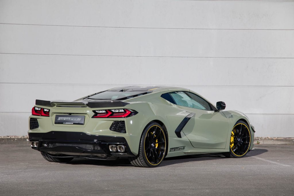 Optisch ist diese GeigerCars-Vette ein echter Hingucker. Mit der Sonderlackierung in Indian Moss Green samt Racing-Streifen in Schwarz und Gelb wirkt der scharf gezeichnete Sportler endgültig wie ein Kampfjet im Tiefflug. Ergänzende Carbonparts sind dabei natürlich Pflicht – in dem Fall in Form des Frontsplitters und des Heckspoilers. Flaps am Bug verstärken den Racing-Touch. Die OZ-Leichtmetallfelgen zu guter Letzt kommen mit schicker Optik und geringem Gewicht: Sie messen vorne 20 und hinten gar 21 Zoll – mit 245/30er sowie 305/25er Michelin-Bereifung. Während die Räder farblich grundsätzlich in Schwarz daherkommen, setzen auch hier gelbe Zierlinien Akzente.