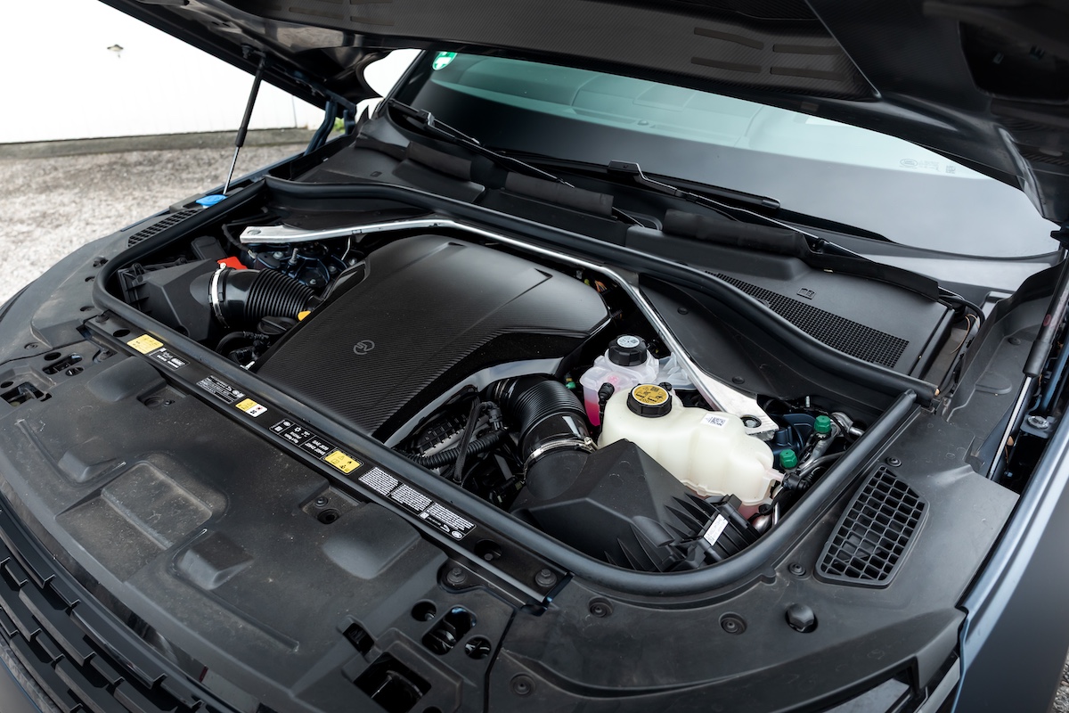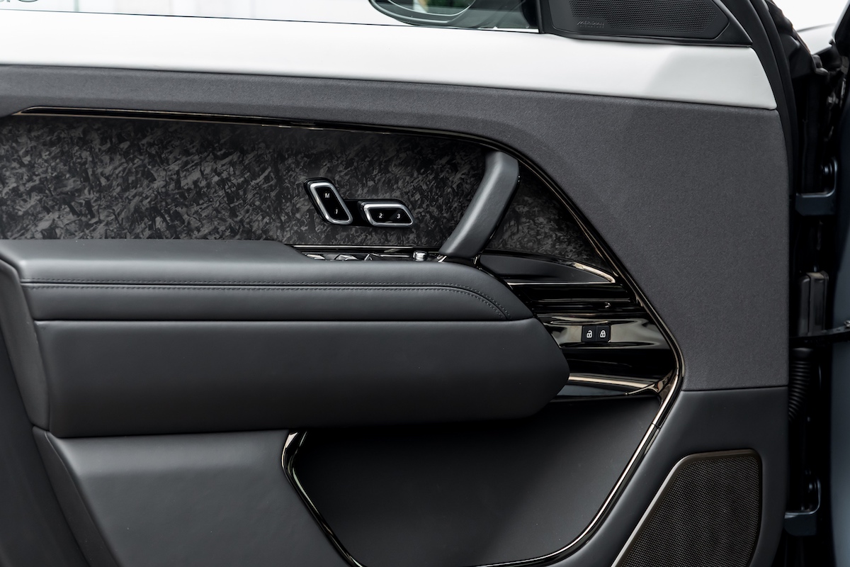 Eine MANHART-Tieferlegung mittels neuer Koppelstangen lässt den SV 800 noch geduckter und sportlicher auf der Straße stehen. Ferner resultiert damit eine satte Ausrichtung der rundum 10×24 Zoll messenden MANHART Concave One-Schmiedefelgen unter den Kotflügeln. Bezogen sind die sich durch doppelte Y-Speichen auszeichnenden Räder mit 295/35er Bereifungen. Während die Farbwahl auf glänzendes Schwarz fiel, sind auf Wunsch auch diverse andere individuelle Finishes möglich. Die Karosserie, an der bereits ab Werk verschiedene Forged Carbon-Bauteile für Aufsehen sorgten, verfeinerte MANHART abrundend mit einem typischen Dekorsatz. Er besteht hier aus glanzschwarzen Zierstreifen auf den Seiten des britischen Power-SUVs.
