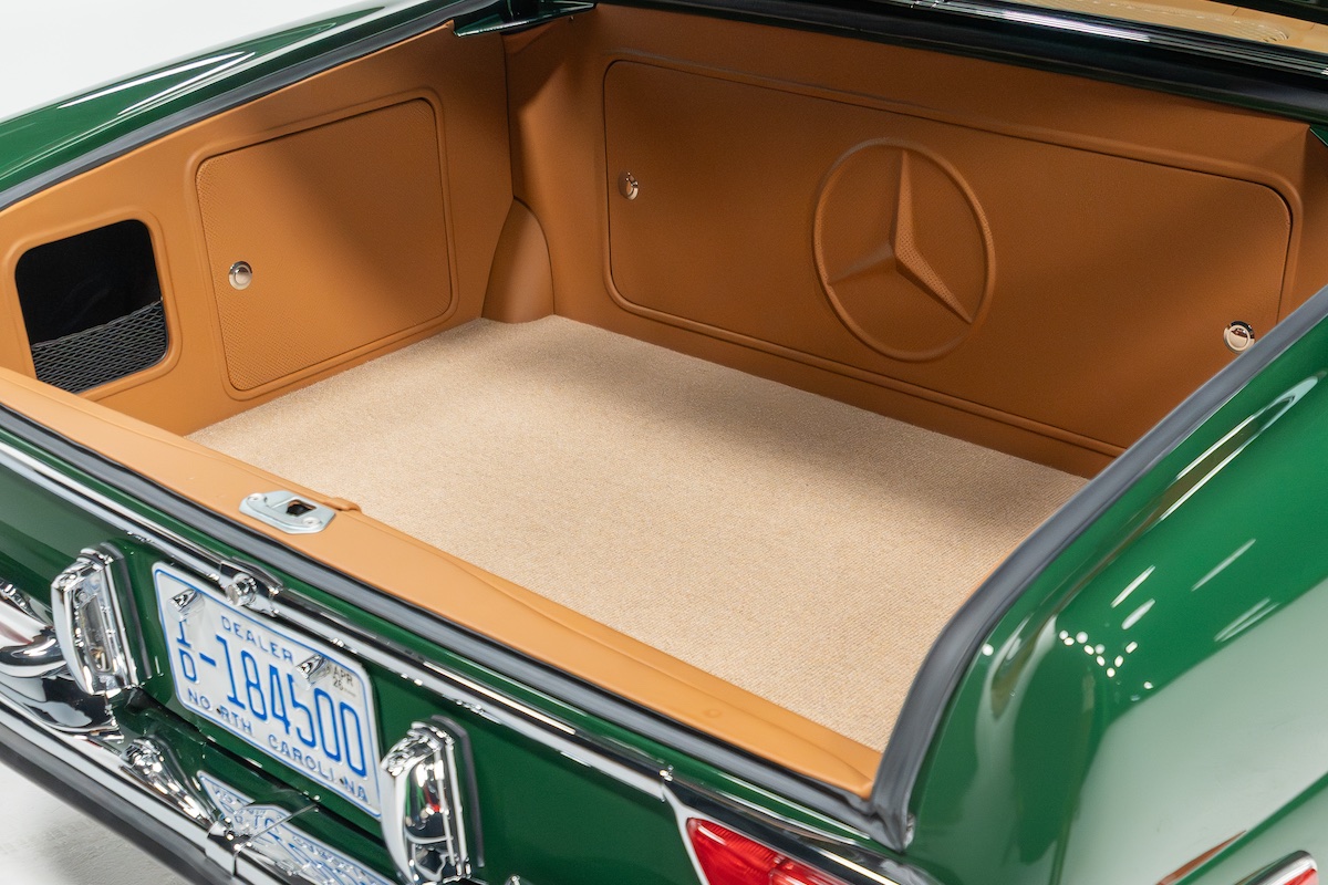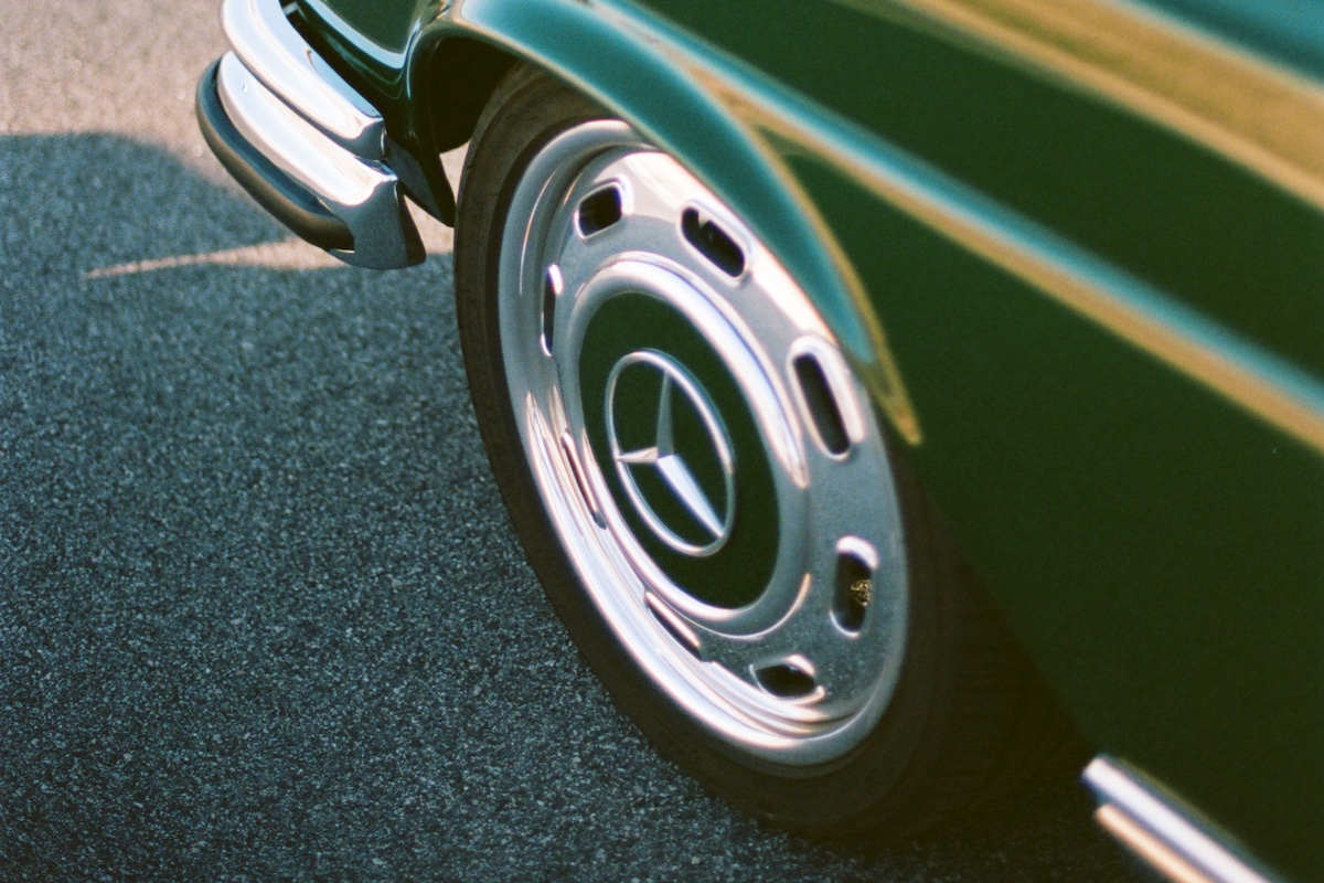 Optisch lässt der Stuttgarter nahezu keine Rückschlüsse auf seinen frischen Antriebsstrang zu. Retro Designs entschied sich dafür, die Restaurierung der Karosserie so originalgetreu wie möglich umzusetzen. So erfolgte nur kaum merkliche Anpassungen wie die Entfernung des Sonnendaches und der Wechsel auf LED-Beleuchtungen. Ferner erhielt der 280 SE eine Neulackierung in gleichermaßen auffälligem und klassischem Irish Green. Selbst die Felgen wirken auf den ersten Blick serienmäßig. Tatsächlich handelt es sich jedoch um von Evod Industries angefertigte, durch die originalen Stahlrädern inspirierte 18-Zöller mit 225/40er Michelin-Bereifung. Die Radkappen sind nicht nur in Wagenfarbe ausgeführt, sondern zudem gelagert, sodass der Mercedes-Stern selbst während der Fahrt stets aufrecht verharrt.
