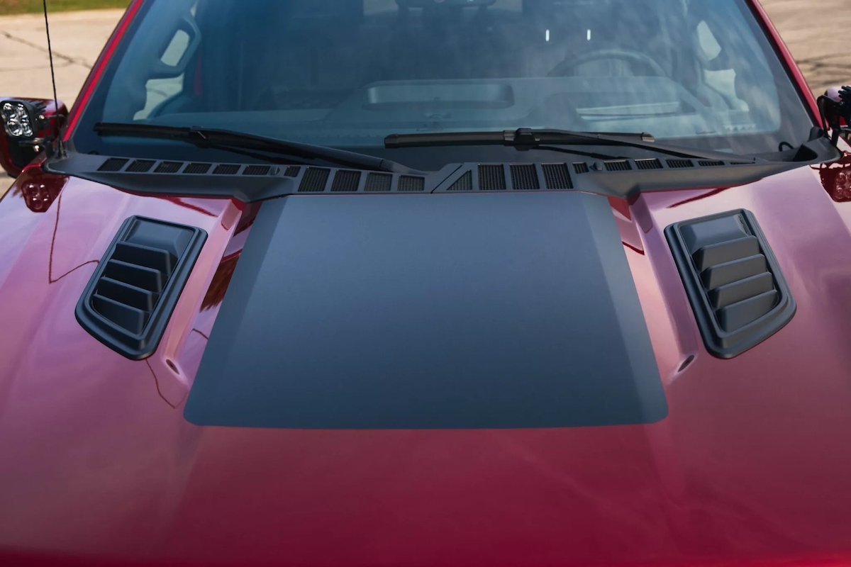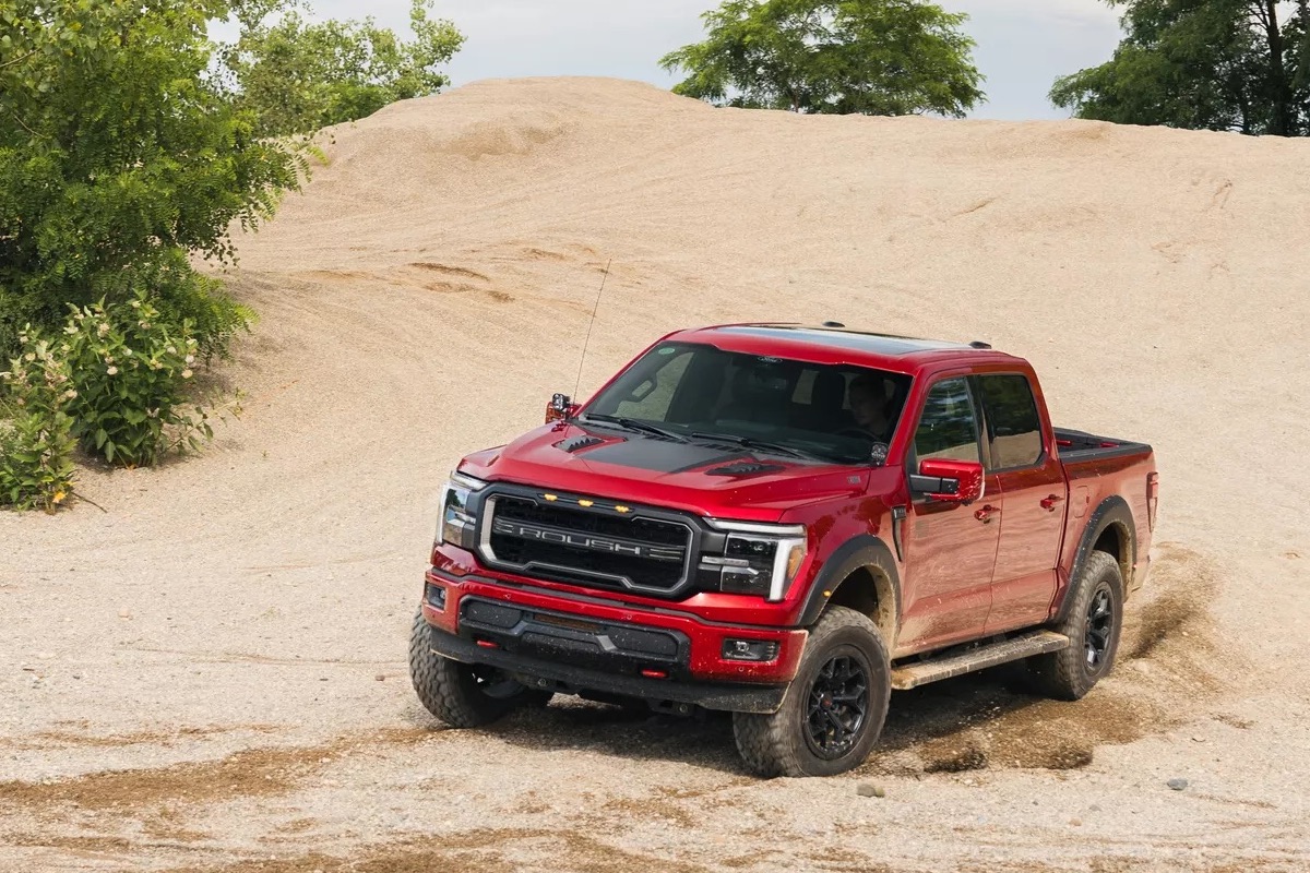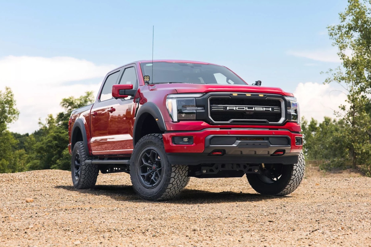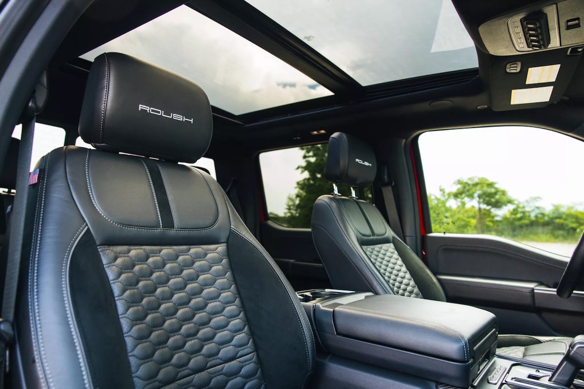 Zu verdanken ist dies in erster Linie dem gänzlich neuen Roush 6.0 Performance-Fahrwerk. Es beschert dem Truck eine Höherlegung um sechs Zoll, also etwa 15 Zentimeter. Dabei bringt es neue Federbeine für die Front, andere Dämpfer und einiges mehr mit. Ein weiteres Plus in Sachen Offroad-Fähigkeit bieten die satinschwarzen 20-Zoll-Roush-Felgen mit grobstolliger General Grabber-Bereifung in 35 Zoll.