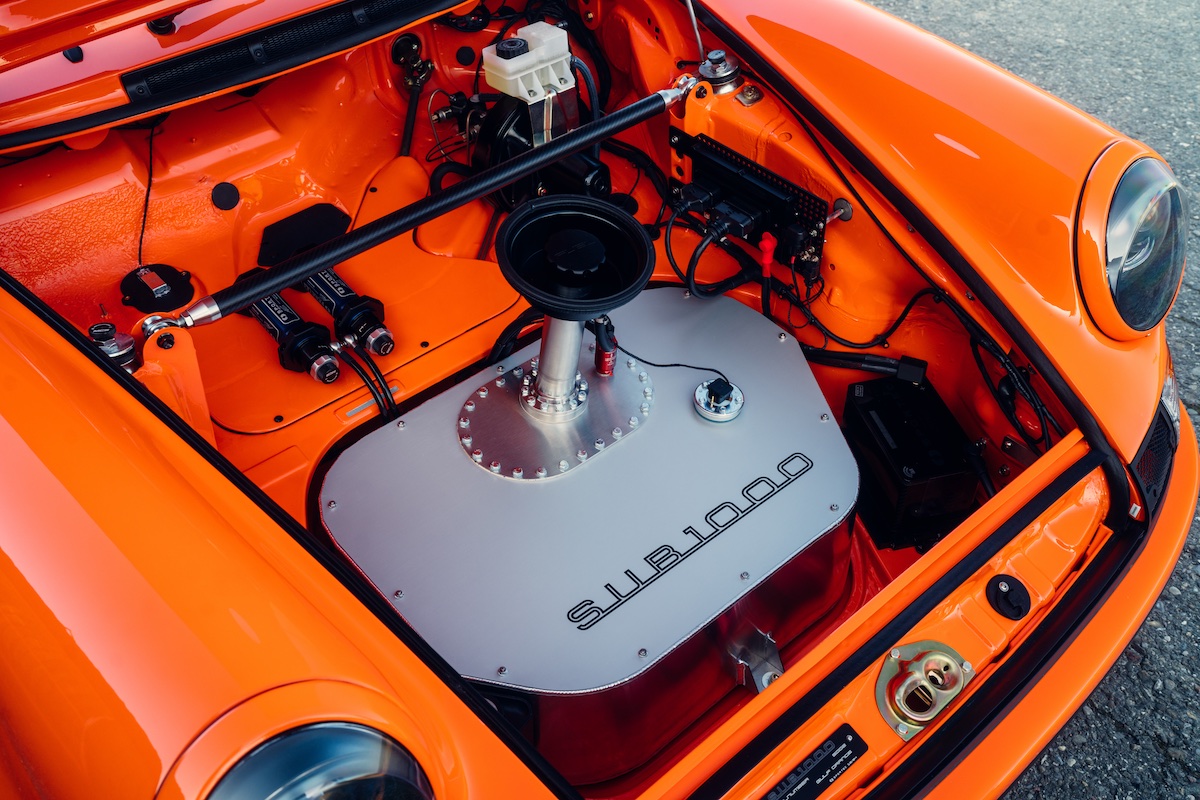 Last but not least zeichnet sich der SUB1000selbstverständlich auch technisch durch eine komplett erneuerte, erstklassige Ausstattung aus. Prunkstück ist zweifellos das im Heck befindliche Triebwerk: Sportec zerlegte den als Basis dienenden, luftgekühlten 3,2-Liter-Sechszylinder-Boxermotor einmal komplett, revidierte ihn und baute ihn mit einem auf 3,6 Liter vergrößerten Hubraum neu auf. Zu den im Rahmen dessen erfolgten Upgrades gehören das optimierte Ansaugsystem, eine erhöhte Verdichtung und bearbeitete Zylinderköpfe mit Sportnockenwellen. Hinzu kamen eine Einzeldrosselklappen-Anlage, ein Hochleistungs-Ölsystem mit elektrischem Gebläse und Zusatz-Ölkühler und ein modernes Motorsteuergerät.
