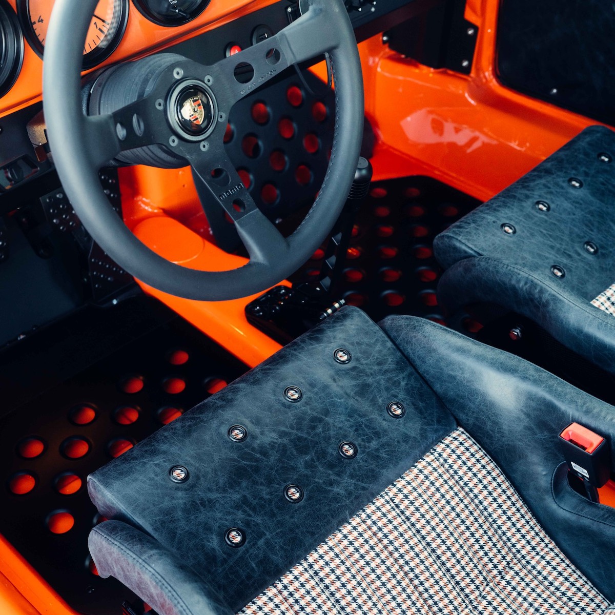 Innenraum: Neuausstattung mit schwarzem Leder und Pepita-Stoff, Instrumente revidiert und individualisiert, Carbon-Armaturenbrett, individualisiertes Momo-Sportlenkrad, Sportec-Schalthebel aus eloxiertem Aluminium, CNC-gefräste Aluminium-Handbremshebel, individualisierte Recaro Pole Position-Sportsitze aus Carbon mit eigenem Seitenadapter, alle Kunststoff-Bedienteile durch gefräste Aluminiumteile ersetzt, 3D-gedruckte Eigenbau-Türgriffe, Türschlaufen aus Pepita-Stoff, Überrollbügel, Aluminium-Pedalerie und -Fußraumbleche, moderner Fahrzeug-Kabelbaum mit CAN-Bus-Funktion, digitaler Motorsport-Sicherungskasten, Leichtbau-Heizsystem mit beheizter Frontscheibe, kein Dämmmaterial und Teppich