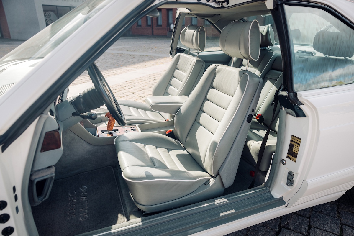 Schließlich erforderte der Wechsel zu Flügeltüren weitreichende Verstärkungen der Karosserie, um deren Steifigkeit zu erhalten. Dies erfolgte derart sorgfältig, dass der Mercedes sogar mit offenen Türen gefahren werden kann. Weitere optische Merkmale: der Bodykit mit sportlich-dynamischen Schürzen und Schwellern sowie dreiteilige BBS-Felgen. Letztere messen 16 Zoll und sind mit 225/50er Bridgestone-Reifen besohlt.