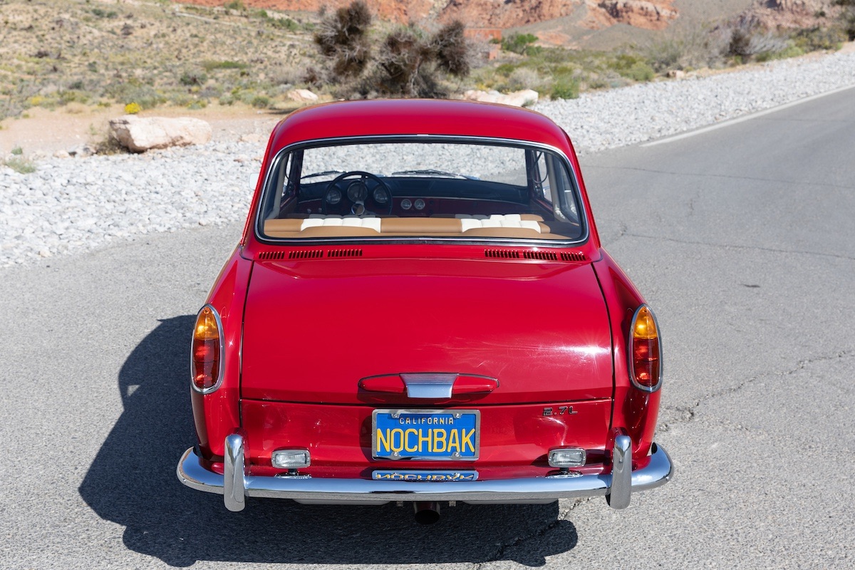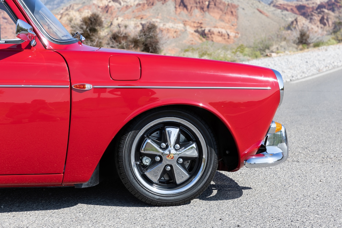 Sogar die abschließende Neulackierung in auffälligem Salsa Red erfolgte in der heimischen Garage. Ebenso in absolutem Topzustand glänzen natürlich die Stoßstangen und diversen weiteren chromsilbernen Anbauteile in der Sonne. Und die schwarzem Räder reihen sich hier mit ihren hochglanzpolierten Frontbereichen und Betten gleichfalls ein. Es handelt sich um 15-zöllige Porsche Fuchs-Felgen. Ihre recht ungleiche Bereifung misst vorne 155/60R15 und hinten 195/60R15, was zur leichten Keilform des Typ 3 beiträgt.