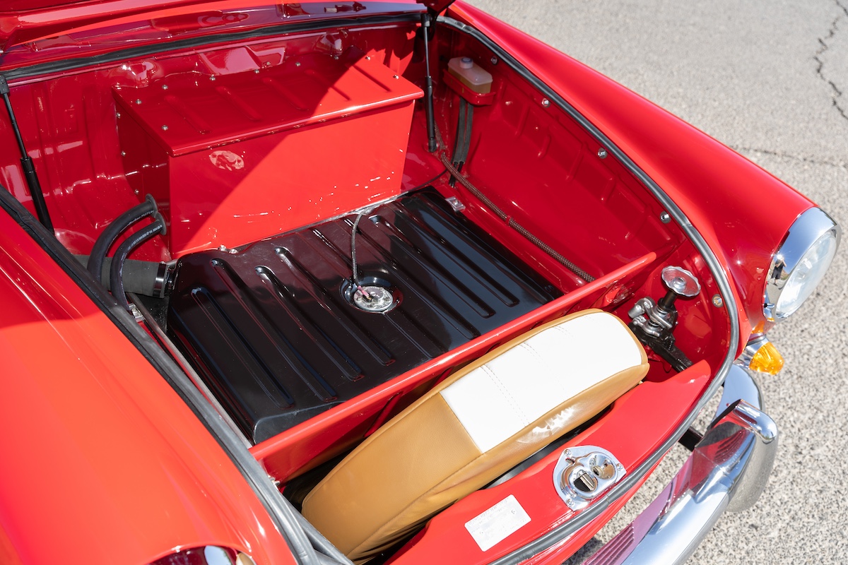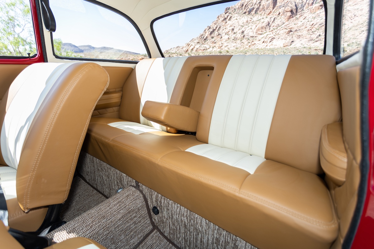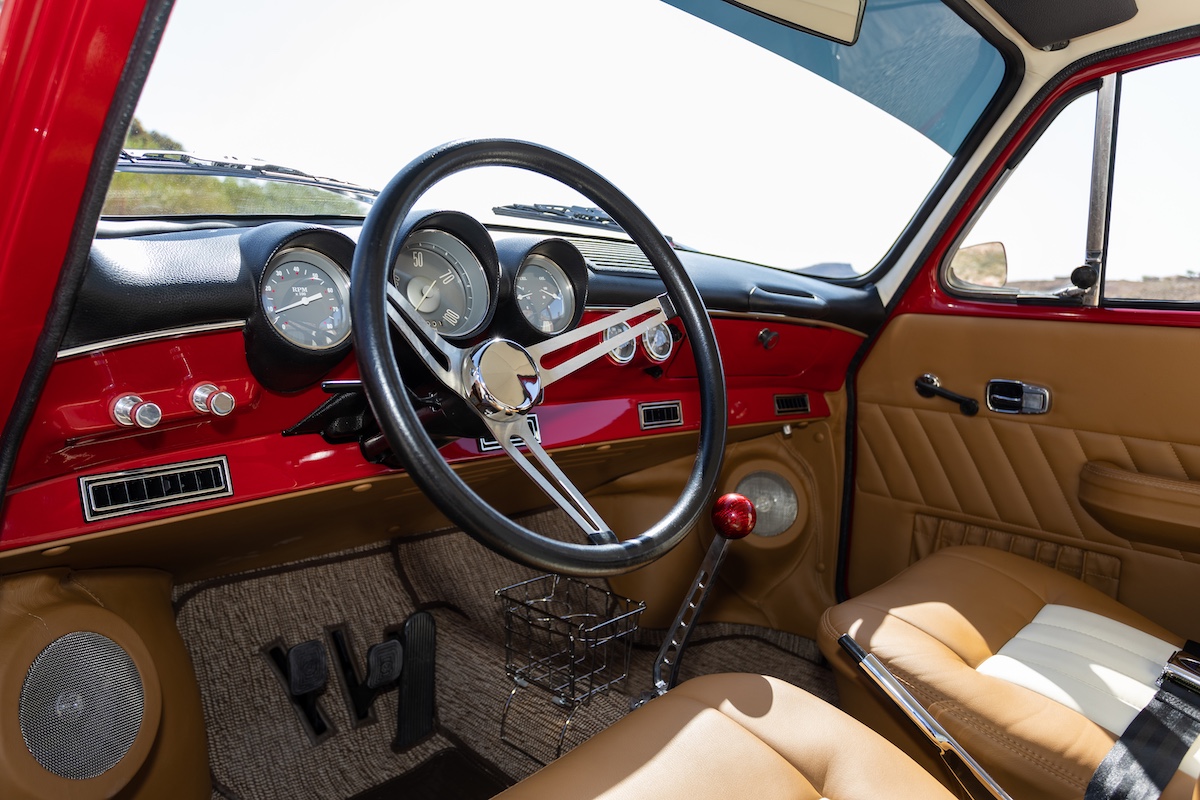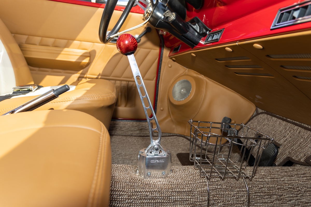 Innenraum: Neuausstattung mit hellbraunem und weißem Kunstleder, hintere Seitenverkleidungen in Eigenbau gefertigt, geschüsseltes Sportlenkrad, Cool Ryders Customs-Schalthebel mit rotem Kugelknauf, Classic Instruments-Zusatzarmaturen für Öl- und Zylinderkopf-Temperatur, Klimaanlage nachgerüstet inkl. Bedienknöpfe am Armaturenbrett, klassische Quadratmaschen-Teppiche in Braun