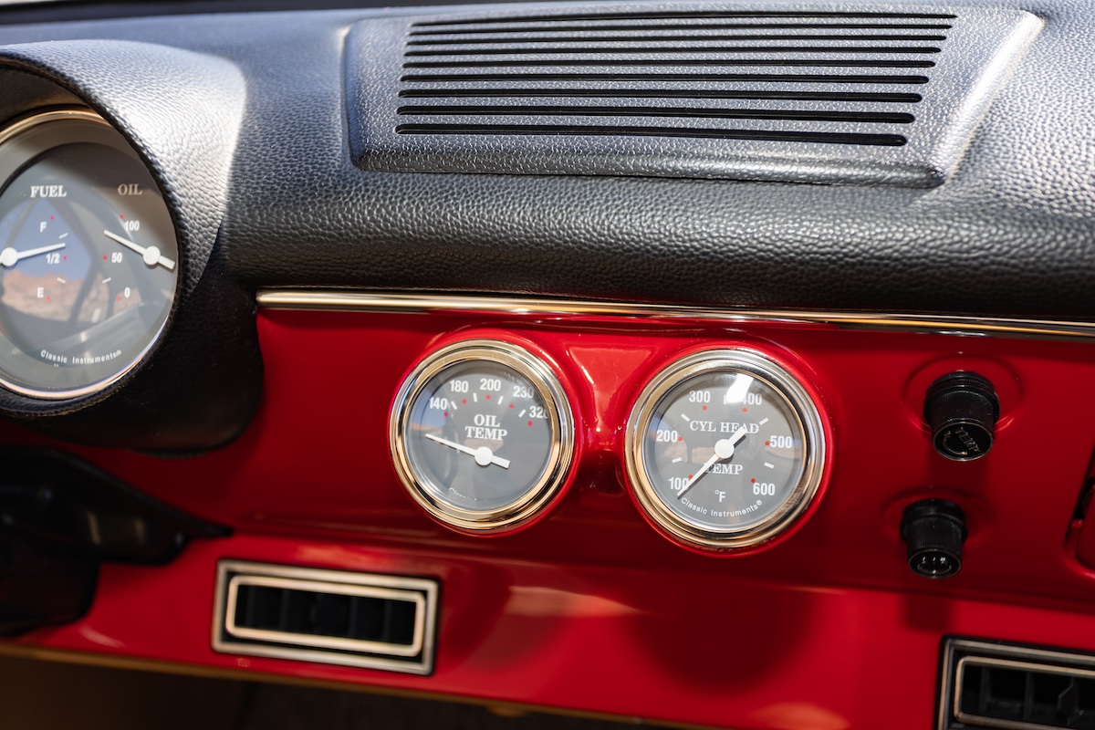 Ein Highlight ist die nachgerüstete Klimaanlage. Sie ist absolut sauber und professionell verbaut mit unter anderem abgedichteten Leitungen, die durch den Heizungsschacht geführt sind. Neben den Klima-Bedienreglern befinden sich am Armaturenbrett zusätzliche Rundinstrumente für die Öl- und Zylinderkopf-Temperatur. Abrundende Eyecatcher sind das geschüsselte Drei-Speichen-Sportlenkrad und der Cool Ryders Customs-Schalthebel mit rotem Kugelknauf.