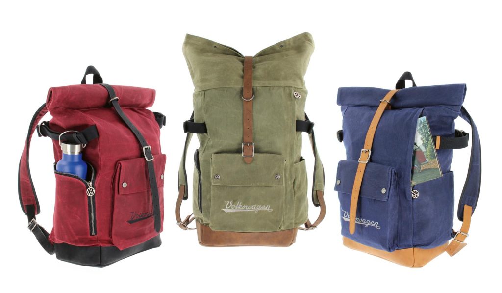 Die VW Vintage-Rolltop-Rucksäcke sind in Blau, Rot und Olivgrün erhältlich und setzen mit ihrem markentypischen Design echte Style-Akzente – ob in den Bergen, auf Reisen oder im Alltag. Gefertigt aus robustem, gewachstem Segeltuch (540 g/m²) und echtem Rindsleder, sind sie nicht nur wasserabweisend und strapazierfähig, sondern auch langlebig und charakterstark. Der verstärkte Lederboden schützt zuverlässig, während die ergonomische Rückenpolsterung für hohen Tragekomfort sorgt. Innen bietet ein gepolstertes Fach sicheren Platz für Tablets oder Laptops bis 17 Zoll.
