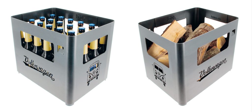 Die stylische Feuerkiste im Retro-Design ist der perfekte Begleiter für spontane Lagerfeuer. Mit Kartoneinsatz wird sie zur Getränkebox, mit Grillrost zum Mini-Grill und mit Bambus-Auflagebrett sogar zum Hocker. Seitliche Bulli-Front und „Volkswagen“-Schriftzug machen sie zum echten Hingucker mit Kultfaktor. Maße: 39 x 27 x 30 cm