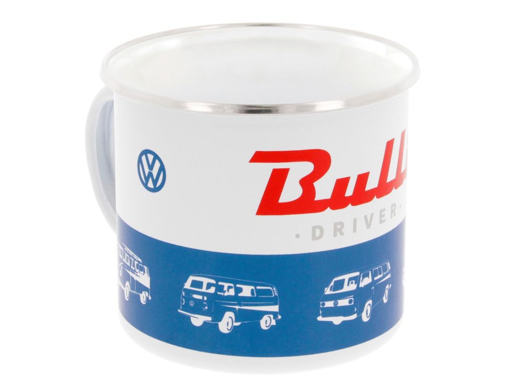 Die coolen Emaille-Tassen mit VW Bus-Motiven gibt’s in vielen Farben und charmanten Retro-Designs. Dank dünnem Stahlrand und abgerundeter Henkel-Form liegen sie perfekt am Mund und in der Hand – leicht, robust und einfach angenehm. Und mit satten 0,5 Litern Fassungsvermögen ist genug Platz für jede Menge Kaffee oder Tee.