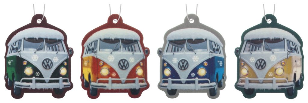 Die Lufterfrischer im Design des VW T1-Bus setzen nostalgische Highlight für die Augen und mit ihren weihnachtlichen Düften insbesondere die Nase: Ihr süßer Duft lässt euch in das Reich der wohlriechenden Gewürze reisen. Verfügbar in Blau (Fresh Ice), Gelb (Vanilla), Grün (Gingerbread) und Orange (Chocolate).