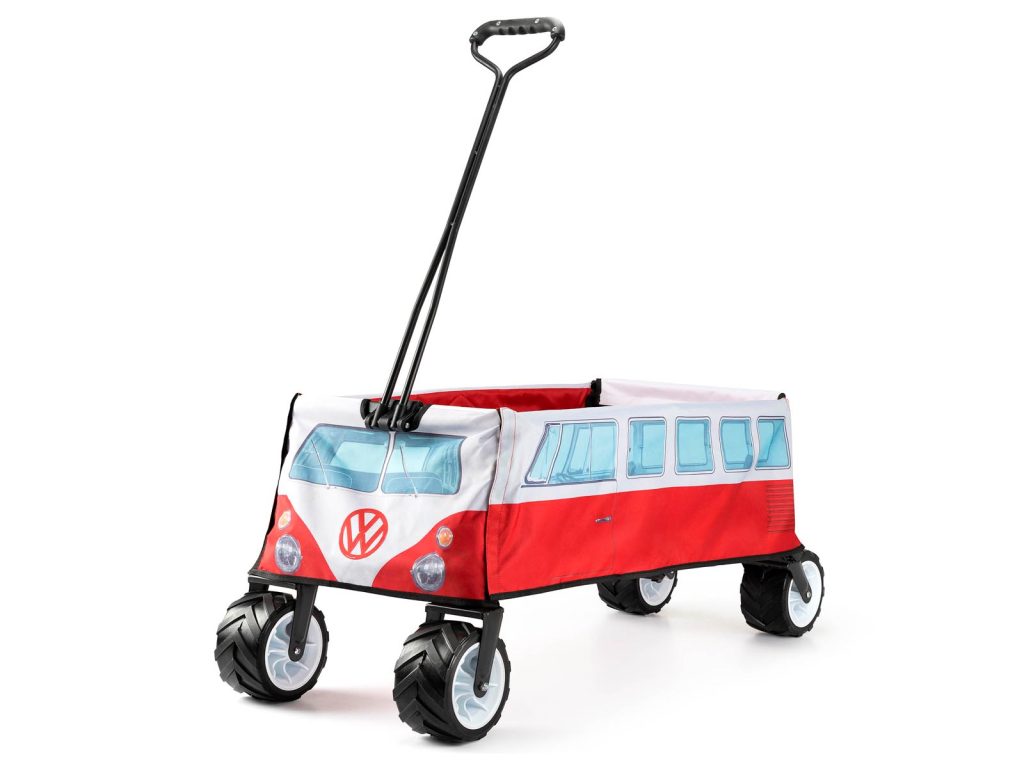 Der faltbare Bollerwagen im coolen VW T1-Design ist immer einsatzbereit – ob für den Strand, das Festival oder das Picknick im Grünen. Dank stabiler Metallkonstruktion trägt er bis zu 80 kg und er rollt mit seinen „Offroad“-Rädern mühelos über Sand und Gras. Mit gepolstertem Stauraum, seitlichen Taschen und integrierten Flaschenhaltern ist er der ideale Begleiter für alle, die Funktion und VW-Flair perfekt kombiniert lieben.
